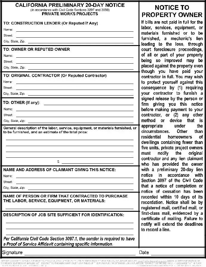 The 20 Day Notice is a legal document used in California for private works projects. It serves as a preliminary notice to property owners, contractors, and construction lenders about the labor, services, equipment, or materials provided or to be provided on a construction project. This notice helps protect the rights of those providing services by informing property owners that they may face a mechanic's lien if bills are not paid in full, even if they have paid their contractor.