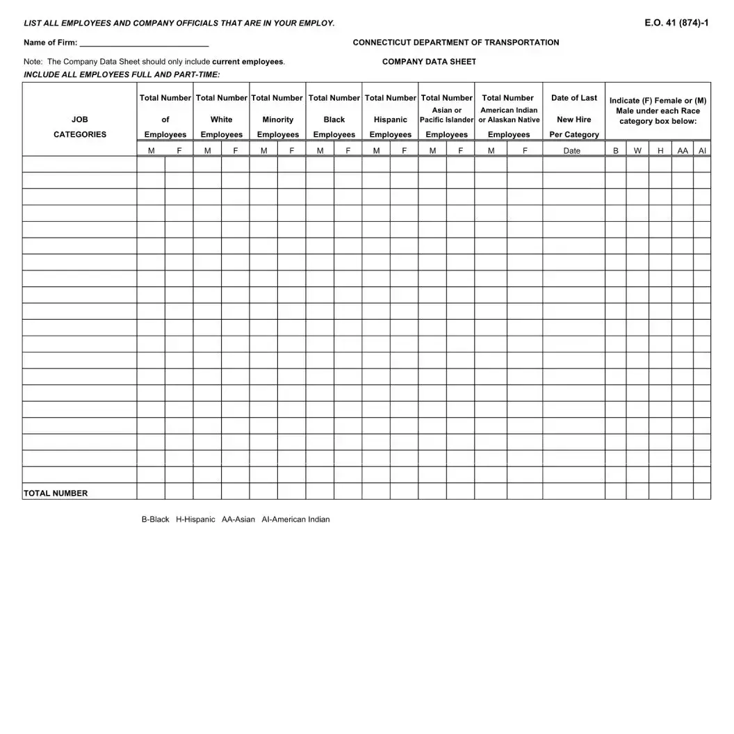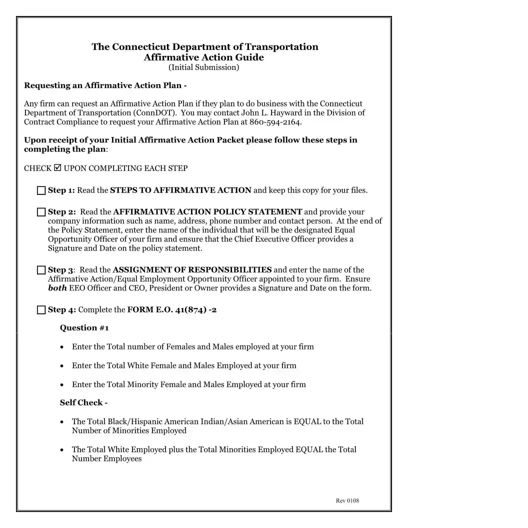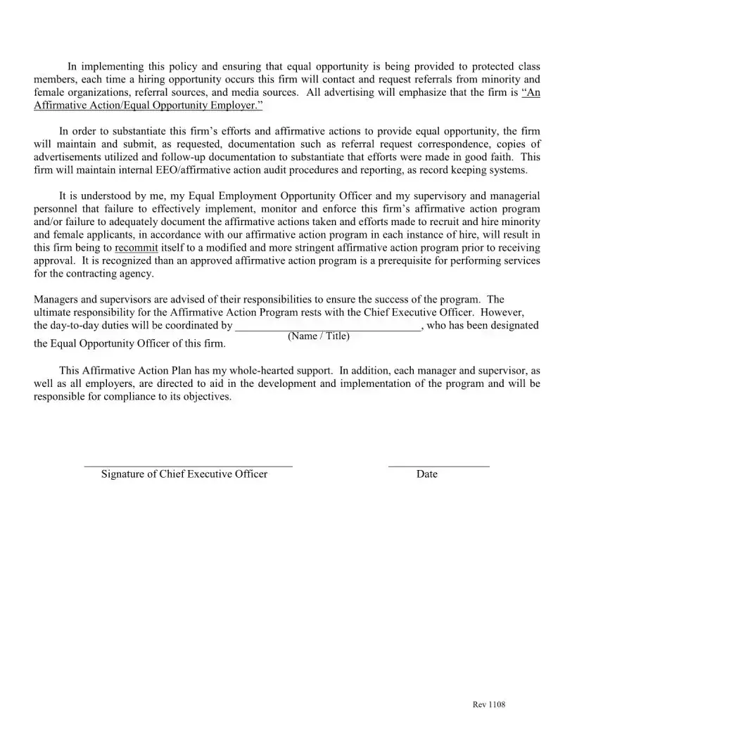 The Affirmative Action Plan form is designed to outline a company's commitment to providing equal employment opportunities to all individuals. It ensures that the company actively works to prevent discrimination based on race, color, religion, sex, national origin, or disability in all employment practices, including hiring, promotions, and training. This plan is essential for compliance with various federal and state laws regarding equal employment opportunities.