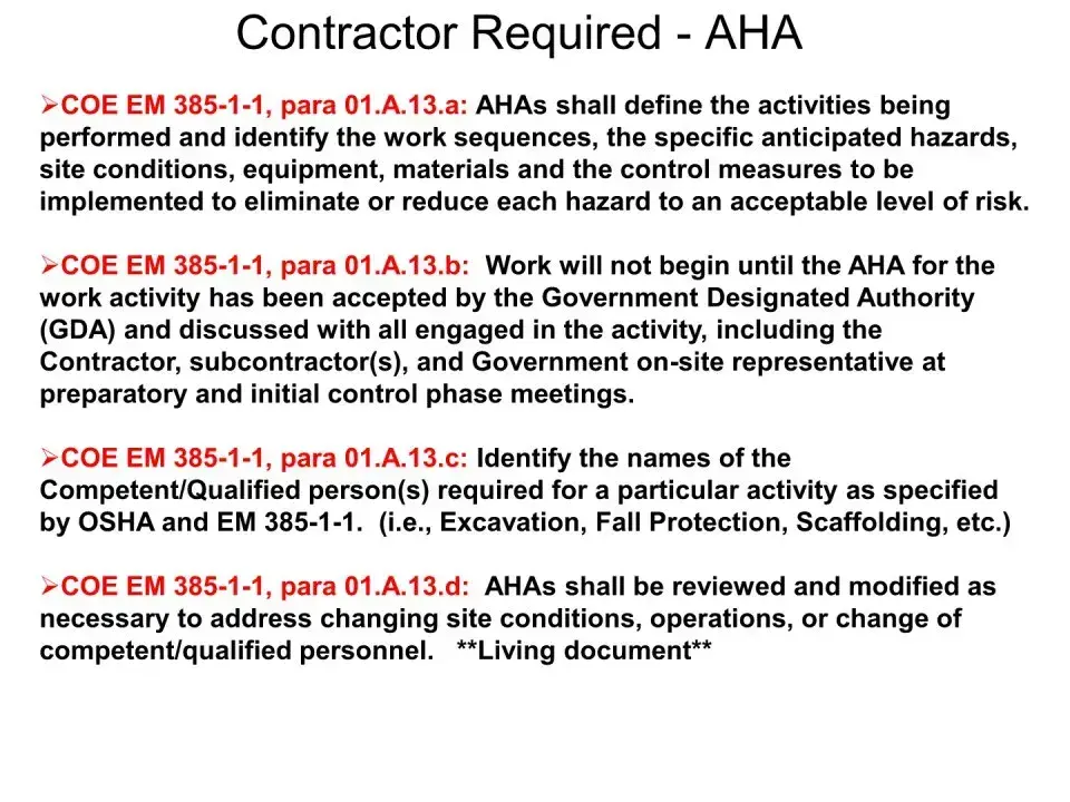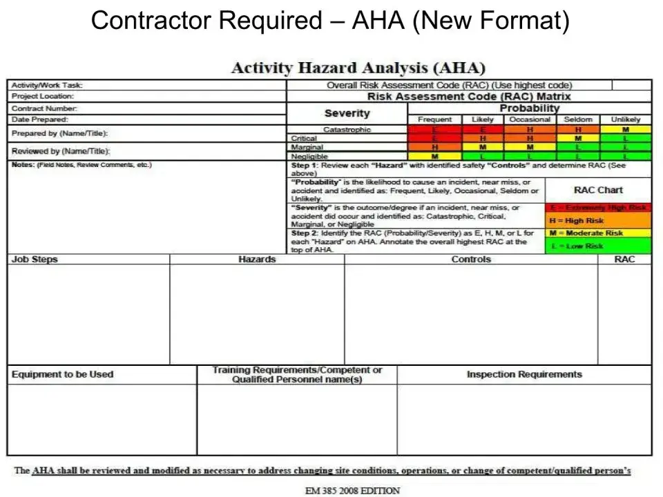 Training is a critical component of the AHA EM 385 process. The form specifies the training requirements for personnel involved in the project, ensuring that they are competent and qualified to perform their tasks safely. Proper training helps workers understand the hazards they may encounter and the controls in place to protect them, fostering a culture of safety on the job site.