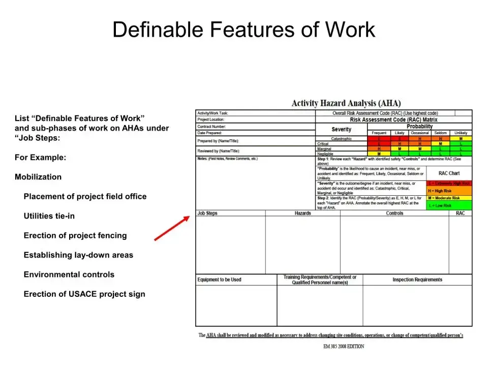 The AHA EM 385 form includes several key components. It outlines the activity or work task, identifies hazards, assesses the overall Risk Assessment Code (RAC), and details the necessary safety controls. Additionally, it specifies the equipment to be used, training requirements, and inspection protocols. This comprehensive approach ensures that all aspects of safety are addressed.