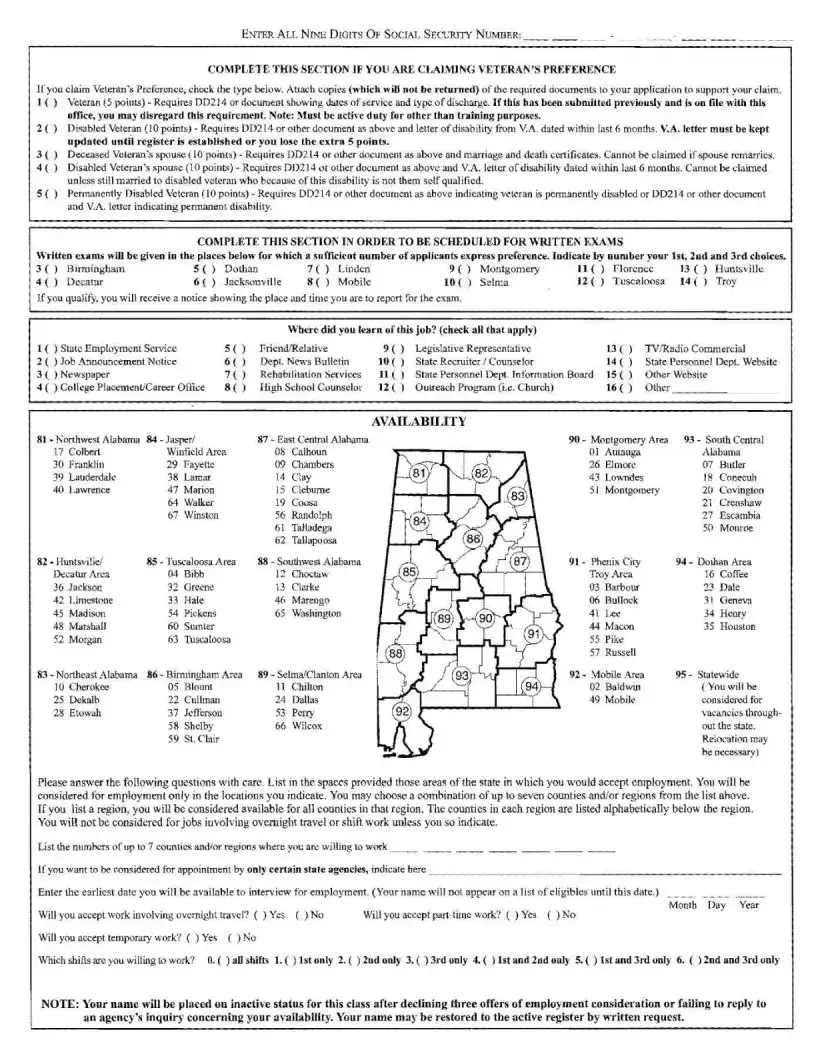 When filling out the Alabama 3 form, it is important to complete all sections accurately and legibly. Each job application requires a separate form. Avoid writing in shaded areas, and do not submit photocopies or facsimiles unless specified. Ensure that your answers are clear, especially in sections regarding your work history and education. If additional space is needed, you may attach separate sheets. Remember to sign and date the form before submission.