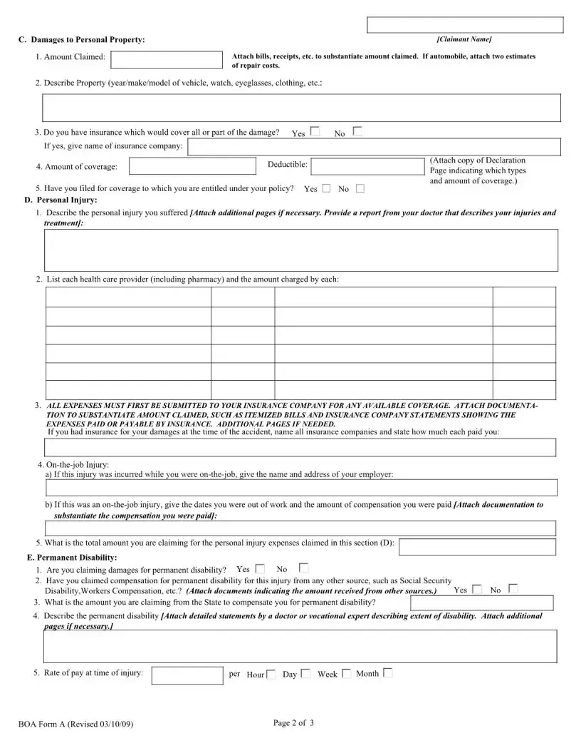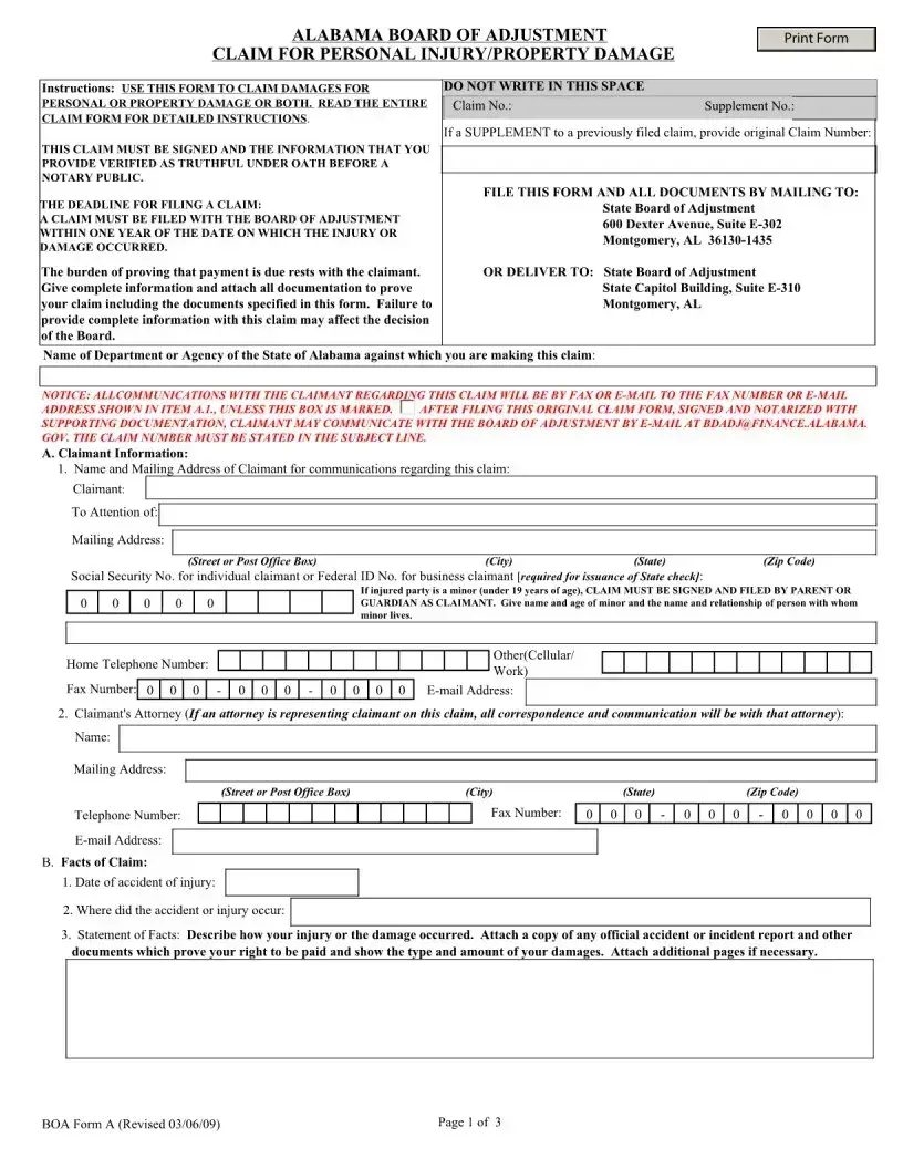 The Alabama Boa A form is specifically designed for individuals or businesses to claim damages for personal injury or property damage. This form allows claimants to formally request compensation from the State Board of Adjustment for losses they have suffered due to the actions or negligence of a state agency. It’s essential to provide thorough and accurate information to support your claim.