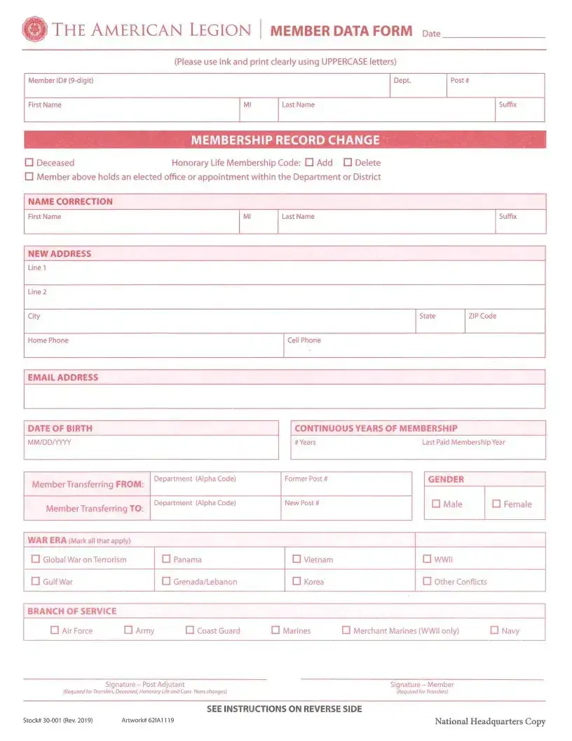 Any member of the American Legion who wishes to transfer their membership from one post to another should fill out the Transfer form. This includes members who are relocating, changing their affiliation, or those who have been elected to a different post.
