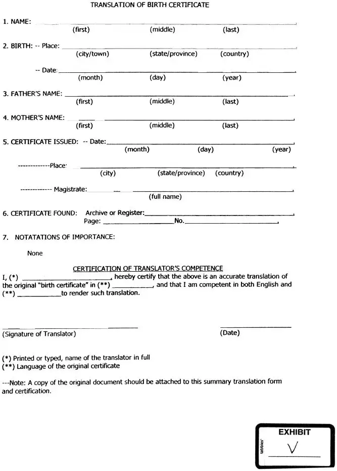To certify the translation of a birth certificate, the translator must complete a section on the form where they affirm their competence in both English and the original language of the certificate. The translator should sign and date this section, providing their printed or typed name. It is essential to attach a copy of the original document to the translation form. This ensures that the translation can be verified against the original, maintaining the integrity of the information.