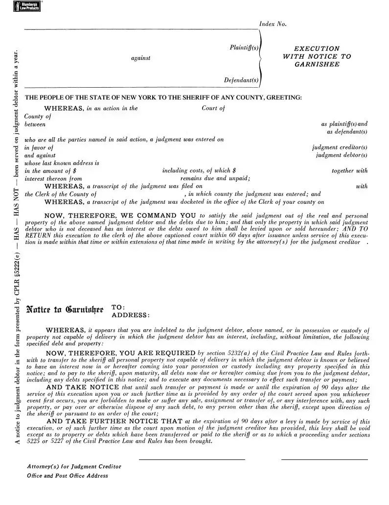 The Blumberg 120 form is a legal document used in the context of executing a judgment against a debtor's property. It provides a framework for a sheriff to collect a debt owed by a defendant. This form notifies the garnishee, typically a bank or employer, about the execution and outlines the amounts exempt from garnishment.