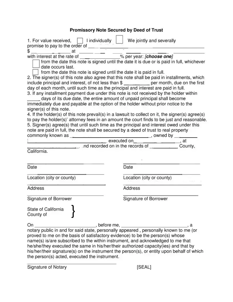 For the California Note Secured form to be legally binding, it must be signed by the borrower(s) and may require notarization. The notary public verifies the identities of the signers and ensures that they understand the document before signing. This step adds a layer of authenticity and protection, ensuring that all parties are entering into the agreement willingly and with full understanding of their obligations.