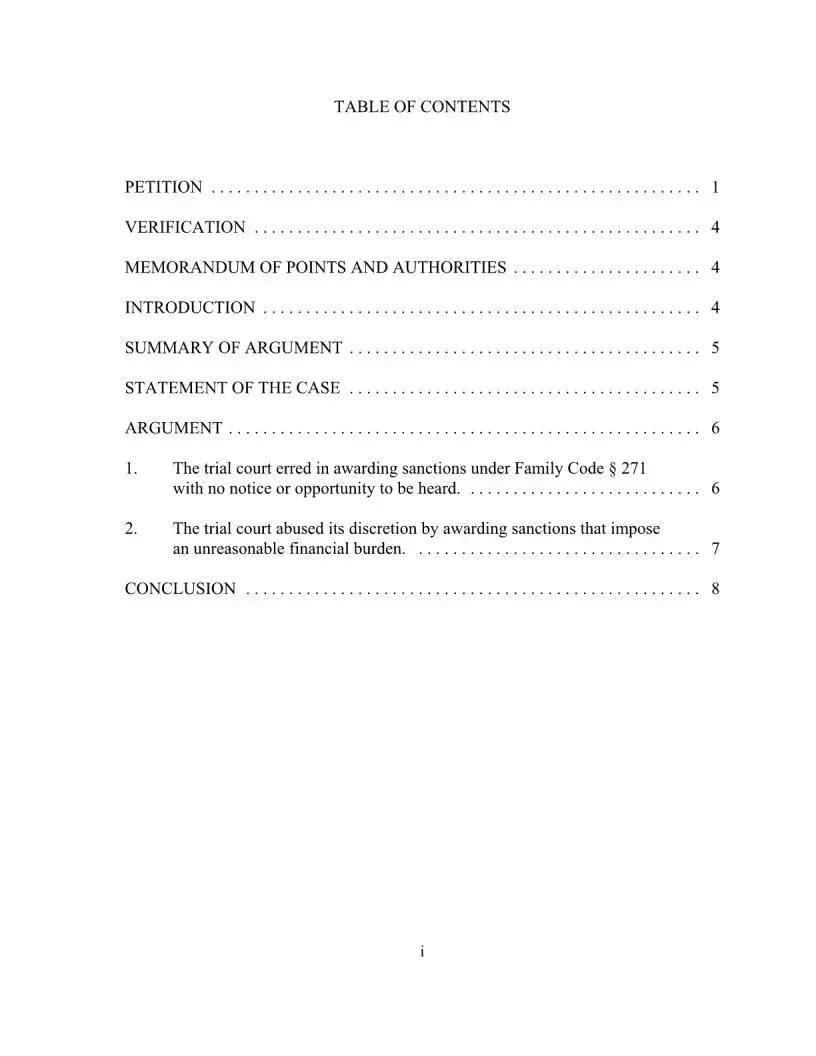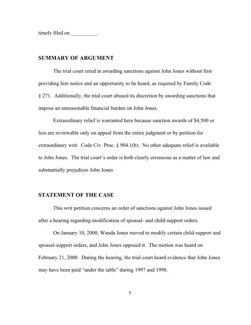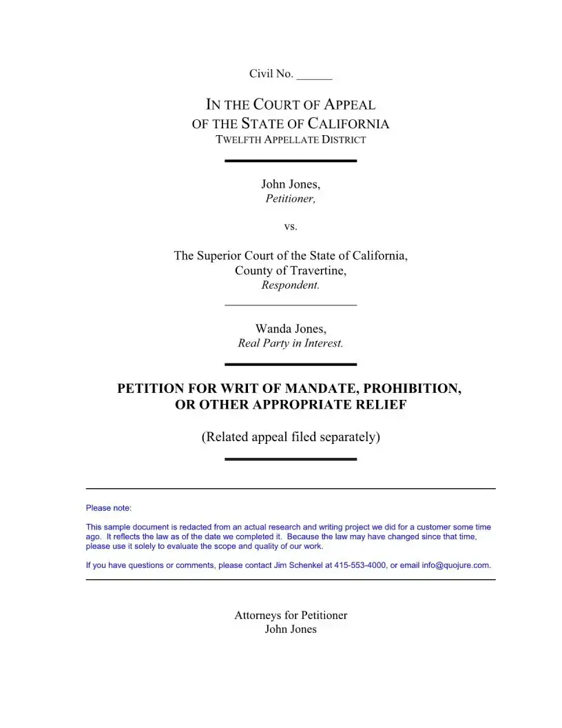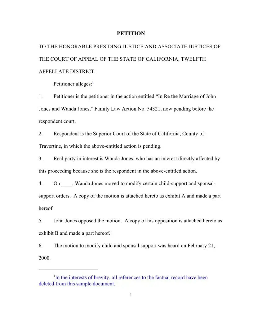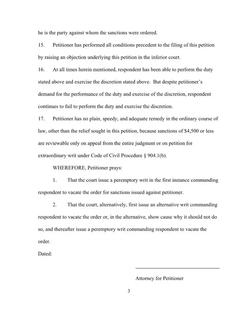 Any individual or entity that is affected by a decision made by a lower court can file a Petition for Writ of Mandate. In the context of family law, this often includes parties involved in divorce or custody disputes. For instance, in the sample document, John Jones, the petitioner, is challenging a ruling made by the Superior Court regarding sanctions imposed without notice.