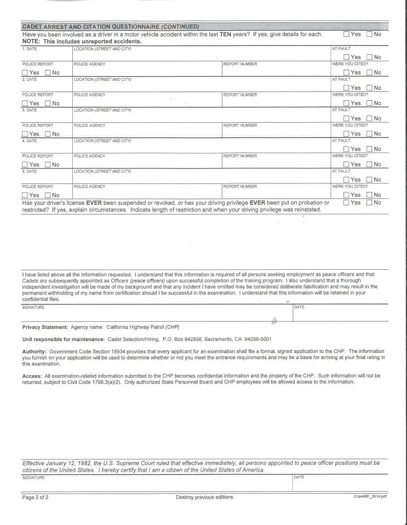 Anyone applying to become a cadet with the California Highway Patrol must complete the CHP 446F form. This includes providing details about all arrests and citations, regardless of when or where they occurred, except for those that have been sealed, expunged, or destroyed under specific legal codes.
