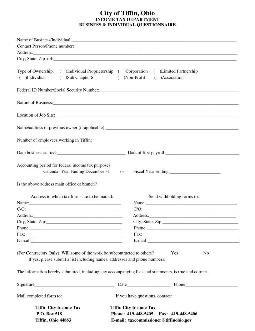 The City of Tiffin Income Tax form is designed to collect essential information from individuals and businesses operating within the city. This information helps ensure compliance with local income tax regulations. By filling out this form, you provide the city with details about your business or personal income, which is necessary for accurate tax assessment and collection.