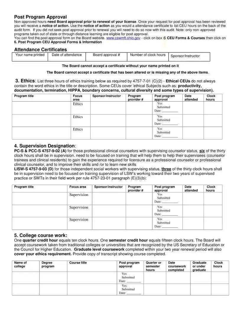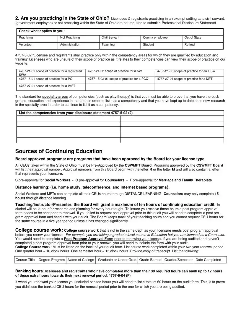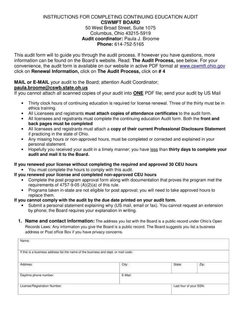 The CSWMFT Ohio Gov form is designed to guide licensees and registrants through the continuing education audit process required for license renewal in Ohio. It ensures that professionals meet the necessary educational requirements to maintain their licenses and stay current in their fields.