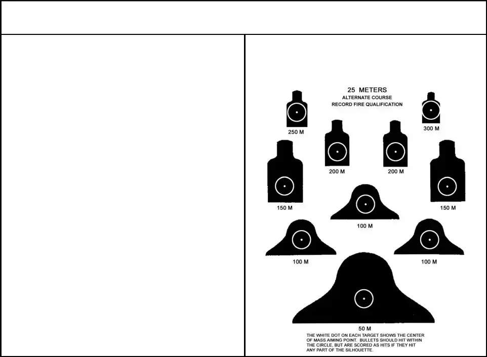 Scoring is based on the number of hits on the target silhouettes. Each silhouette can earn a maximum number of hits depending on its distance. For example, targets at 50 and 100 meters can earn up to 5 hits, while those at 200, 250, and 300 meters can earn up to 3 hits. The total score is calculated by adding the hits from all tables.
