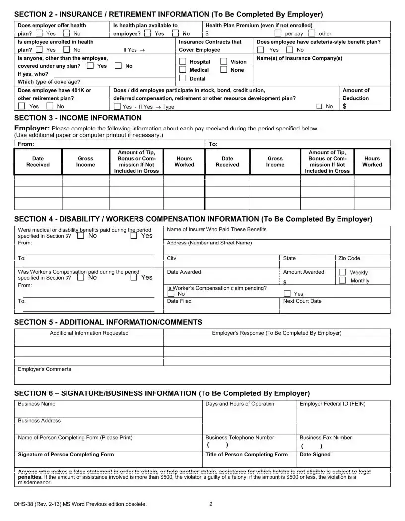 The DHS 38 form is designed for employers to provide essential employment and income information to the Michigan Department of Human Services (DHS). This information is crucial for various inquiries or investigations conducted by the department, particularly when determining eligibility for assistance programs. By completing this form, employers help ensure that individuals receive the benefits they are entitled to based on their employment status and income.