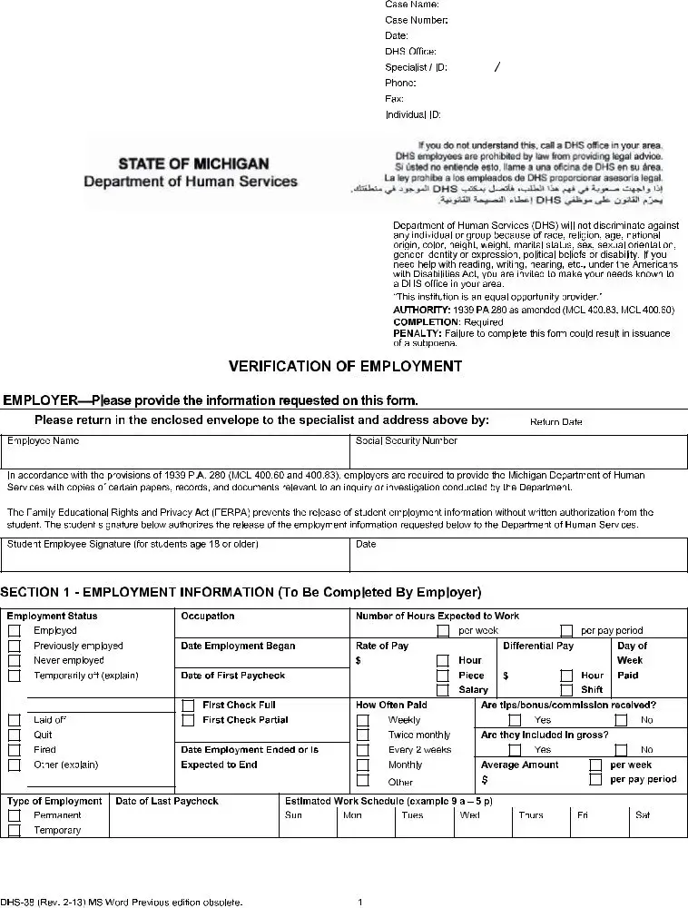 Employers are mandated to complete the DHS 38 form when requested by the Michigan Department of Human Services. This requirement stems from the provisions of the 1939 Public Act 280, which obligates employers to provide specific records and documents relevant to the department's inquiries. Additionally, if an employee is a student aged 18 or older, their signature is required to authorize the release of their employment information.