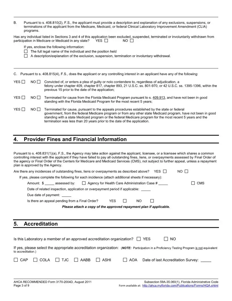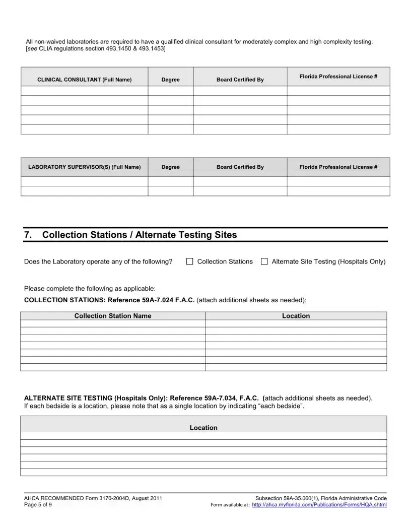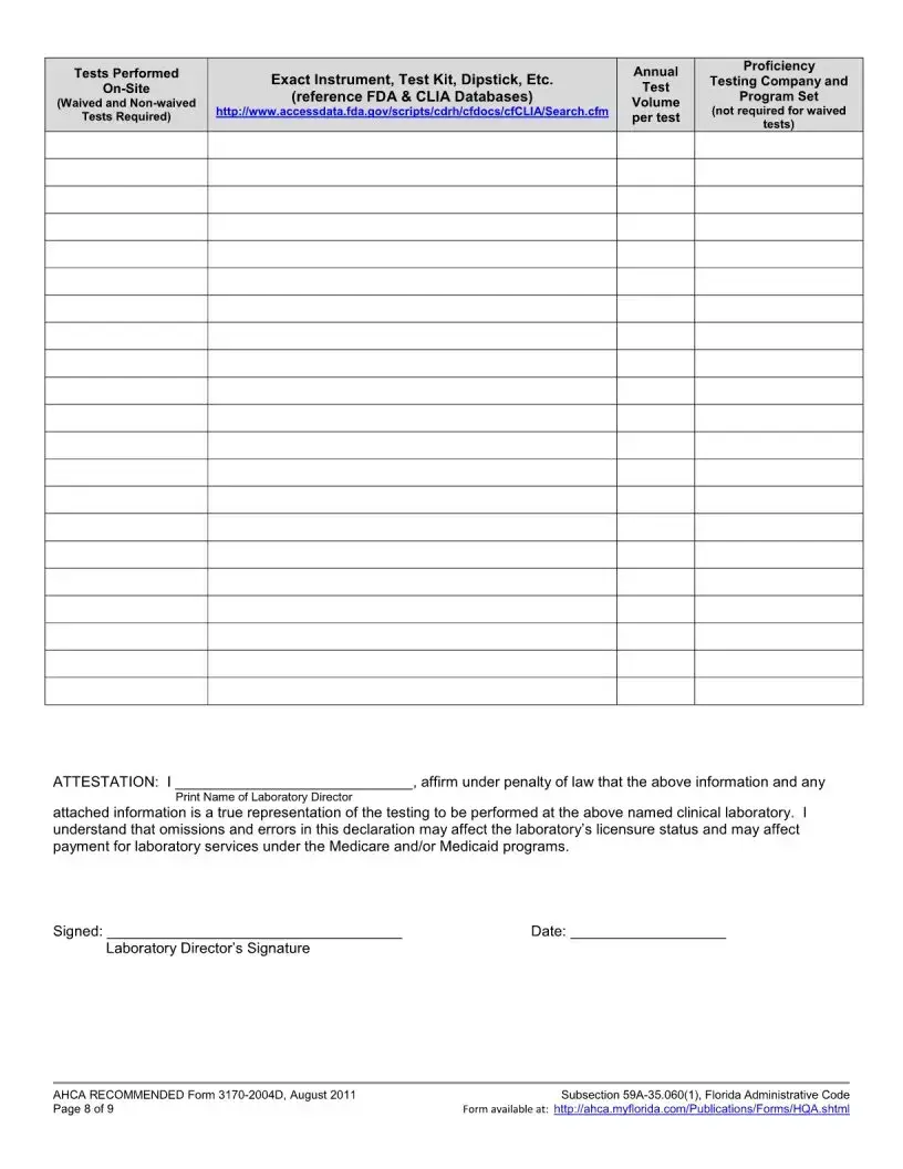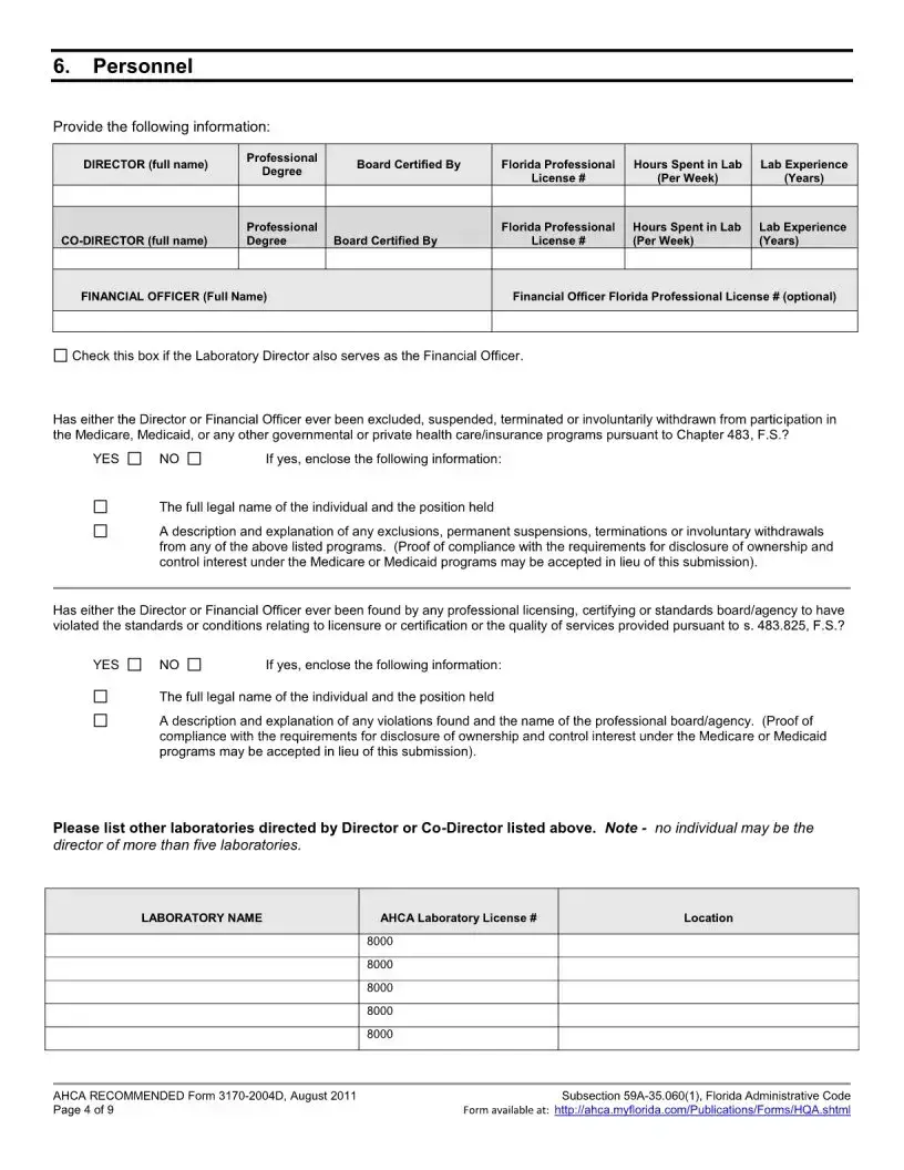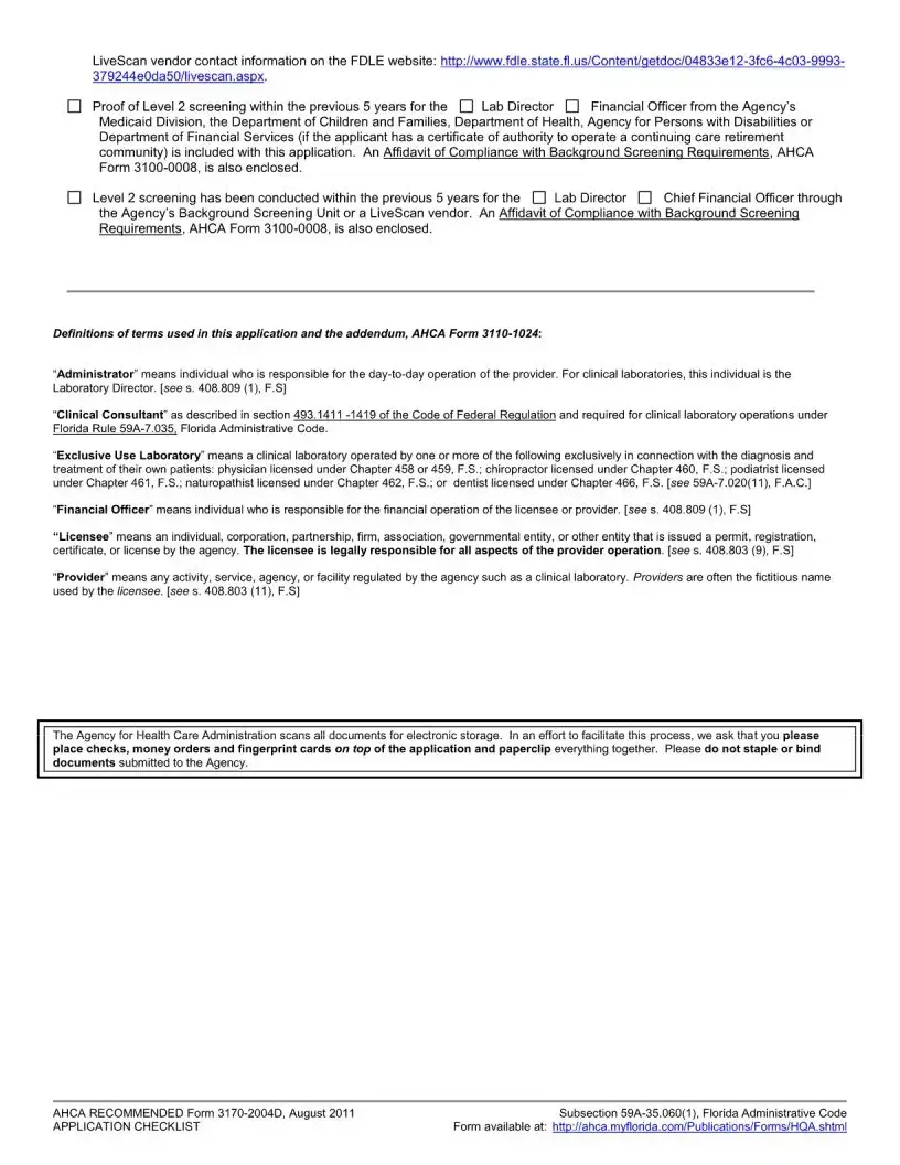 Applicants must include several attachments with the Florida 3170 form. These include a completed federal CMS 116 form, a copy of the medical or professional license, evidence of the director's qualifications, and proof of Level 2 background screening for both the Lab Director and Financial Officer. Additionally, an Affidavit of Compliance with Background Screening Requirements must be enclosed. All required documents must be submitted together to avoid withdrawal of the application.