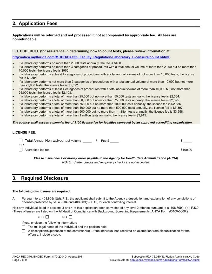 The application requires a licensure fee, which is outlined in Section 2 of the form. This fee is nonrefundable, and applicants must ensure that they submit payment in the form of a check or money order made out to the Agency for Health Care Administration. Starter checks and temporary checks are not accepted. Applicants may also incur late fees if the application is submitted less than 60 days before the expiration of the current license.
