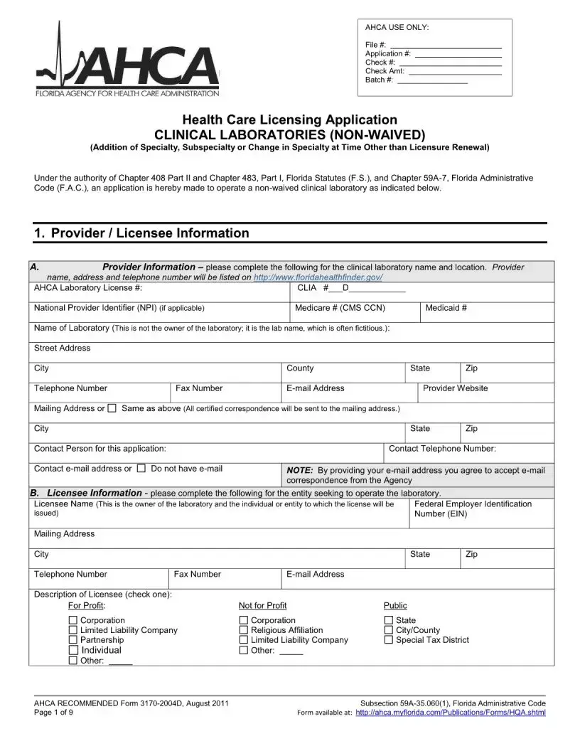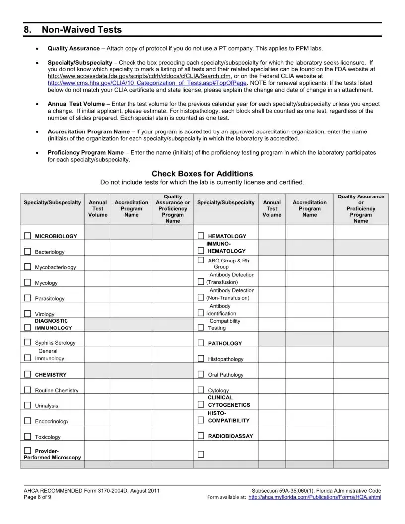The Florida 3170 form is an application for health care licensing specifically for clinical laboratories that are non-waived. It is used when a laboratory seeks to add a specialty or subspecialty, or change its specialty outside of the regular licensure renewal period. This form ensures that laboratories comply with relevant Florida statutes and administrative codes regarding health care operations.