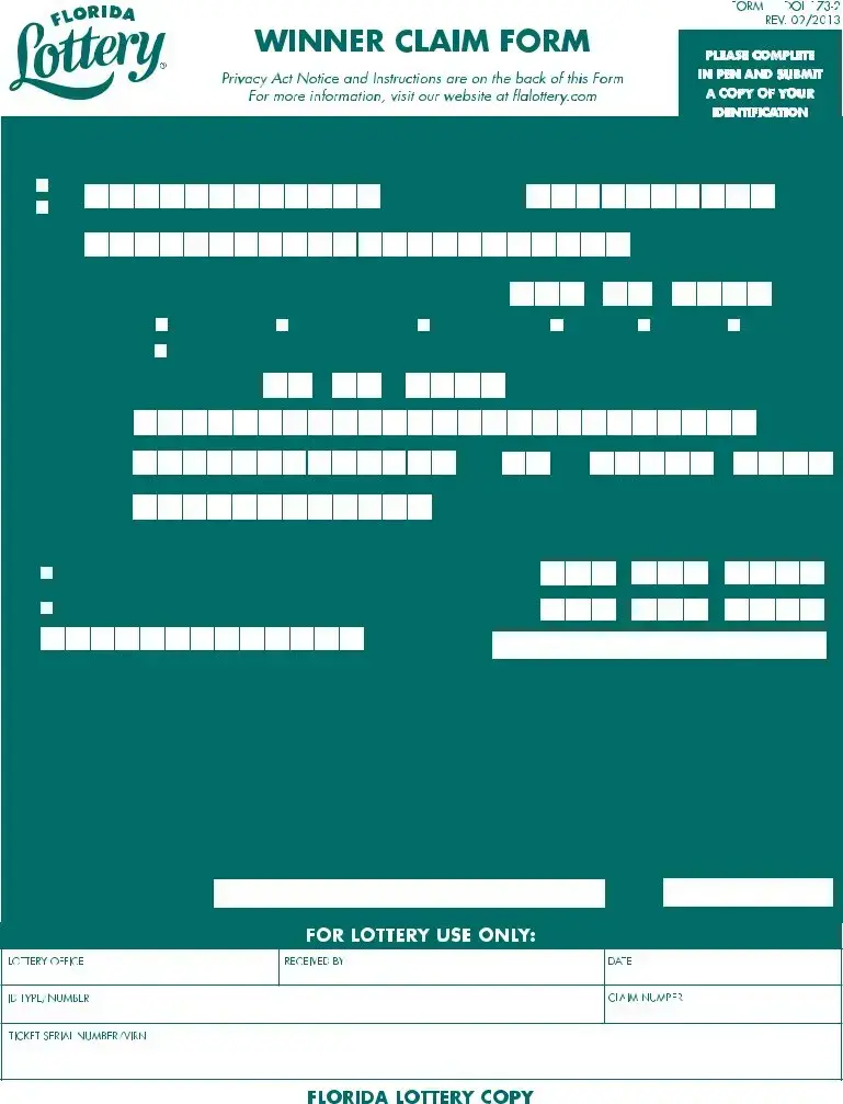 To complete the form, fill out your name as it appears with the IRS, provide your Social Security number or taxpayer identification number, and select your claimant type. You must also sign and date the form. If claiming a prize of $600 or more, include a copy of an acceptable form of identification.