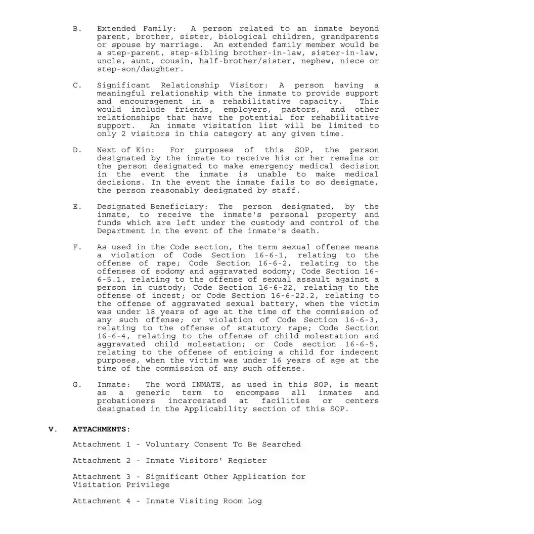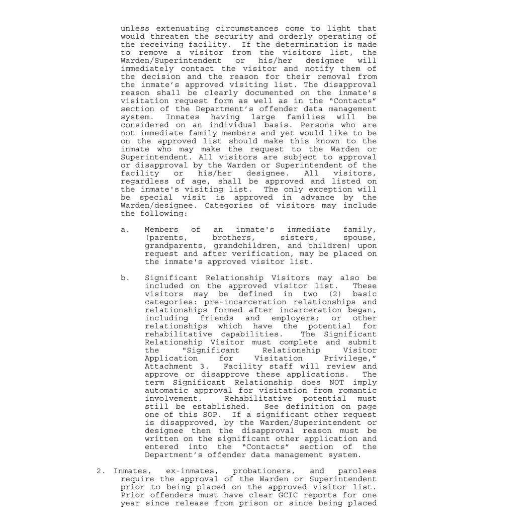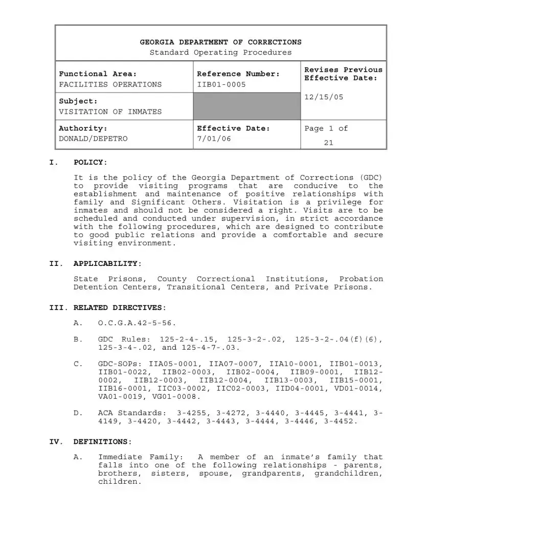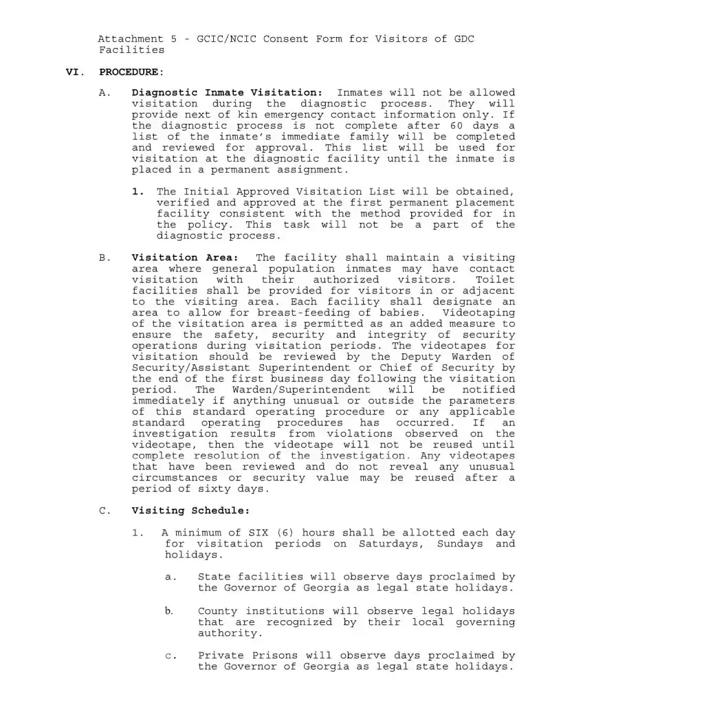 The Georgia SOP form outlines the policies and procedures for inmate visitation within the Georgia Department of Corrections. Its primary goal is to facilitate positive relationships between inmates and their families or significant others while ensuring a secure and comfortable visiting environment.