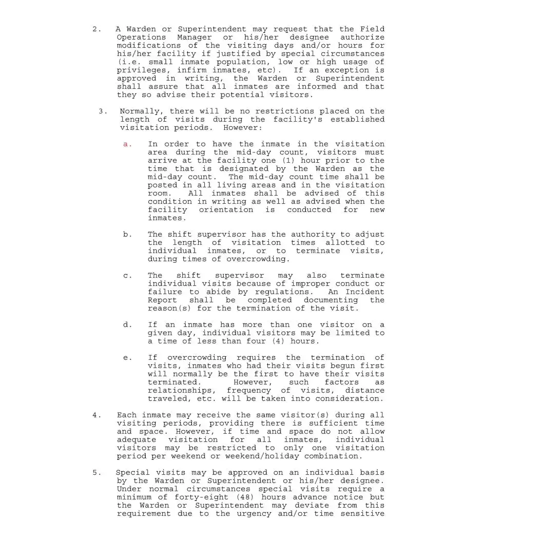 Each facility must provide at least six hours of visitation each day on weekends and holidays. Specific hours may vary, and facilities may adjust these based on special circumstances, such as inmate population or usage of privileges.
