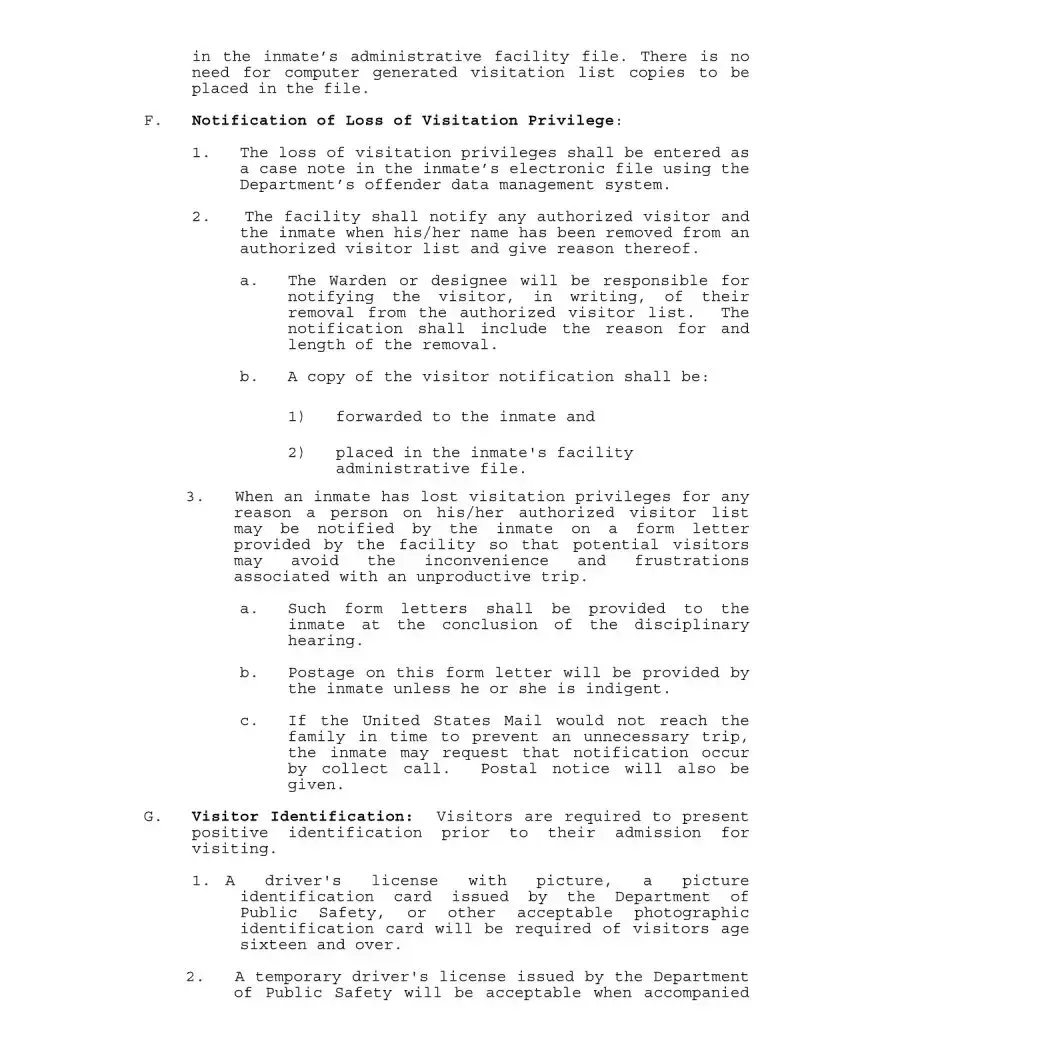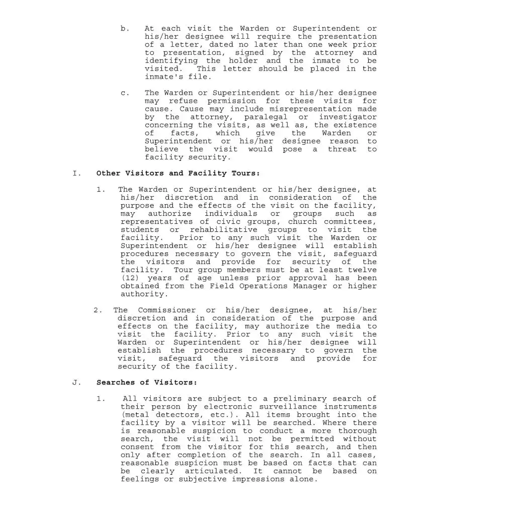 Facilities maintain designated visiting areas and provide restroom facilities for visitors. Additionally, videotaping of the visitation area is permitted to enhance safety and security. Any unusual incidents captured on tape will be investigated, and the tapes will not be reused until the investigation is complete.