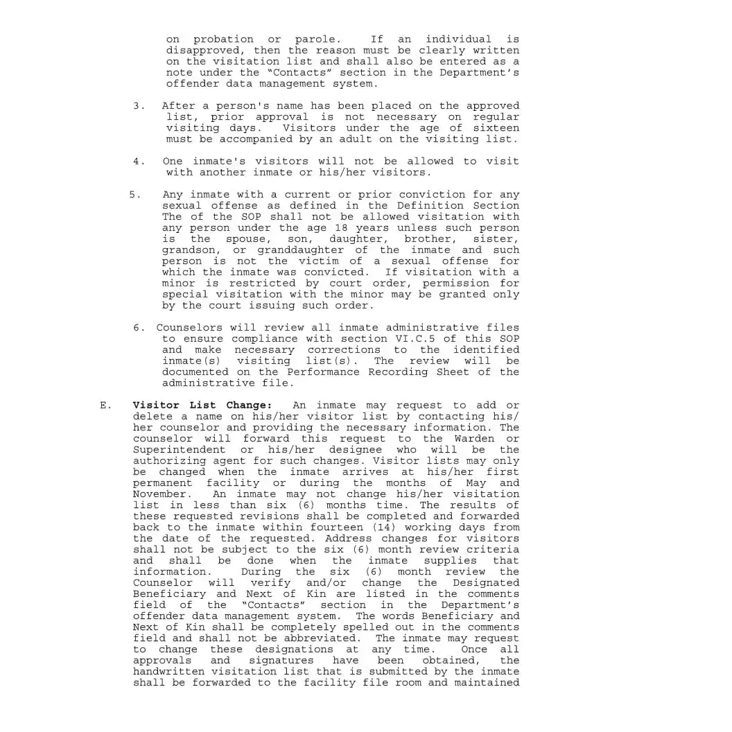 During the diagnostic process, inmates cannot have visitors. After this period, an initial approved visitation list is created, verified, and approved at the inmate's first permanent placement facility. This list is essential for scheduling future visits.