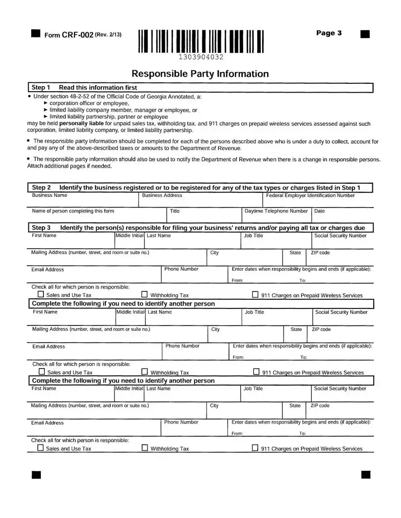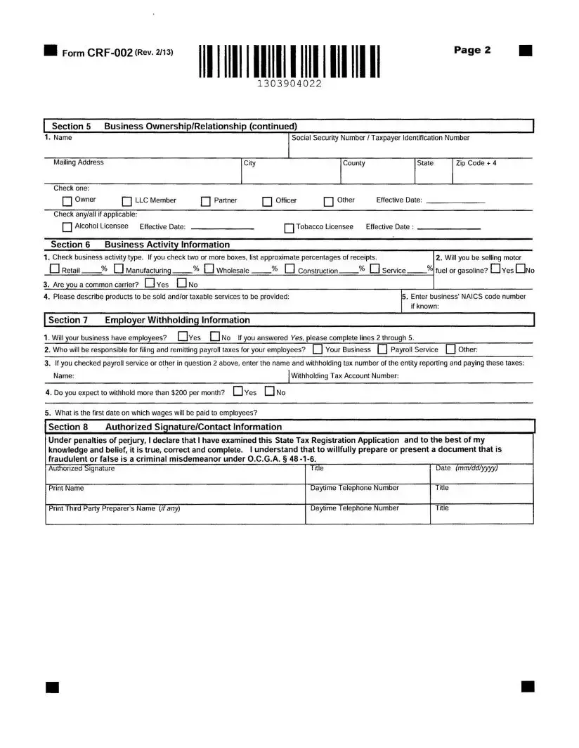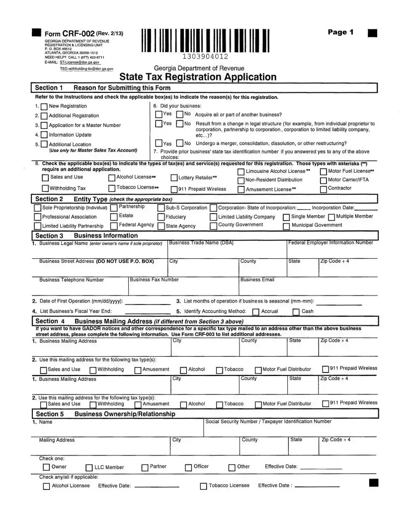 The Georgia State Tax Instruction form, known as Form CRF-002, is designed for businesses to register for various state taxes. This includes new registrations, additional registrations, and updates to existing information. By completing this form, businesses can ensure they comply with Georgia tax laws and obtain the necessary tax identification numbers.
