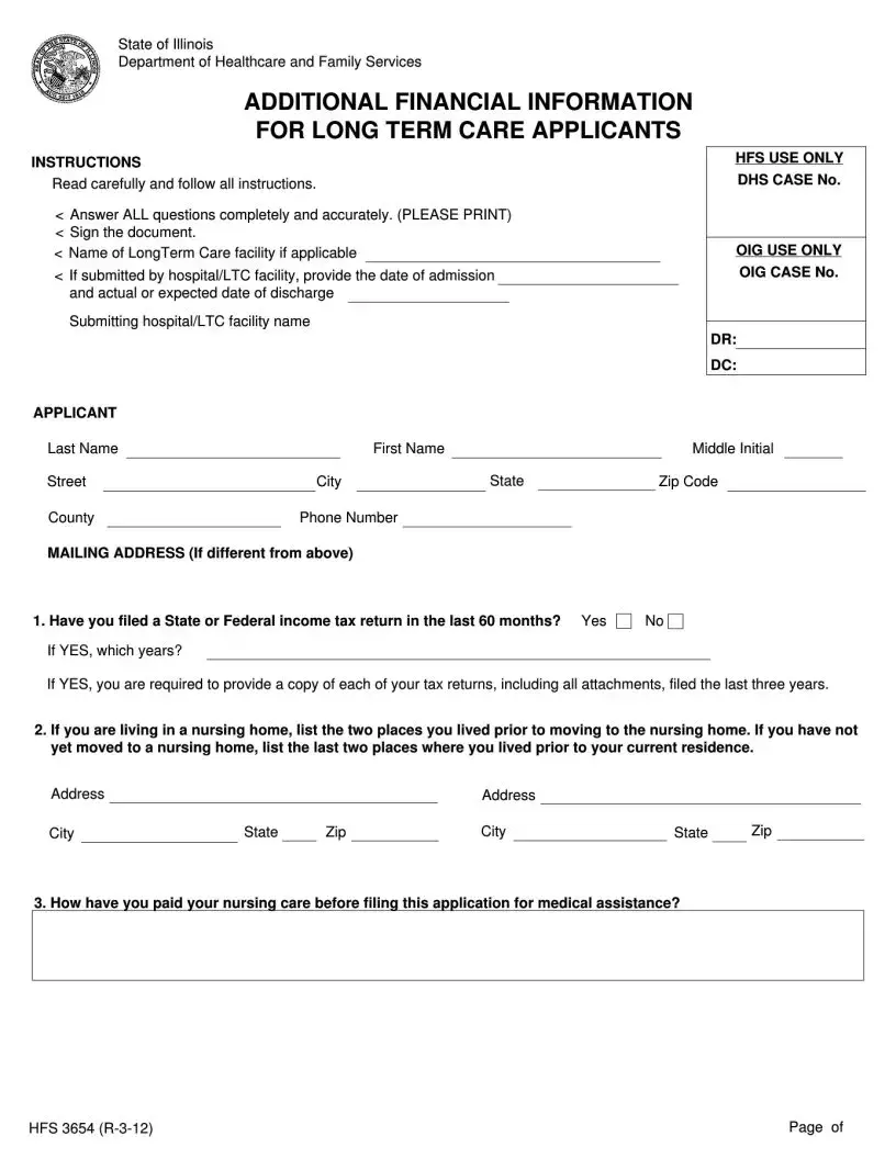 The HFS 3654 form is designed to gather additional financial information from individuals applying for long-term care assistance in Illinois. It helps the Department of Healthcare and Family Services assess eligibility for medical assistance based on the applicant's financial situation. By providing detailed financial data, applicants can ensure that their needs are accurately evaluated and that they receive the appropriate level of support.