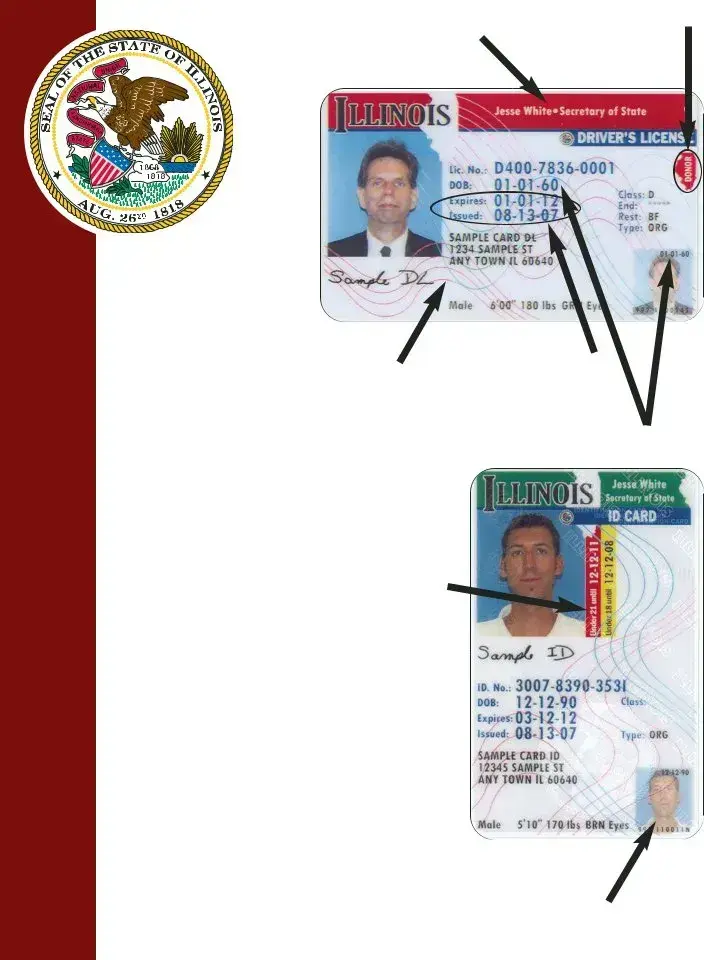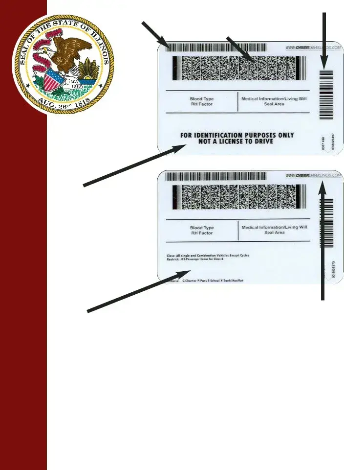 The Illinois Driver's License includes various security features to prevent fraud. These features consist of a guilloche pattern in the background, a ghost image of the photo, and the date of birth displayed in two locations. Additionally, there are UV elements, holograms, and microtext to enhance security further.