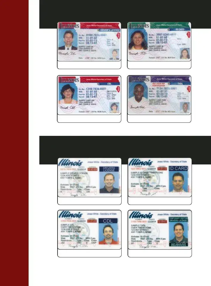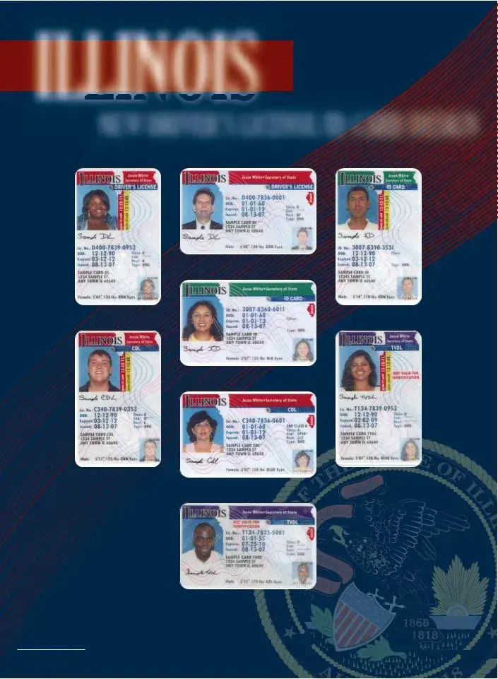 Illinois offers several types of driver's licenses and ID cards. These include the standard Driver’s License, Under 21 Driver’s License, Commercial Driver’s License (CDL), Temporary Visitor Driver’s License (TVDL), and ID Cards for both general and Under 21 users. Each type has its own specific features and requirements.