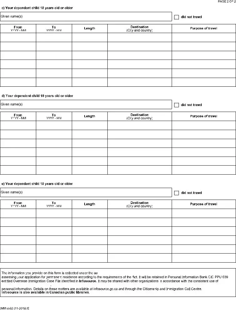 The principal applicant must complete the IMM 5562 form. If the applicant has family members, such as a spouse or dependent children aged 18 or older, their travel information should also be included. It is essential that all relevant trips taken outside the applicant's country of origin or residence in the past ten years are documented on this form.