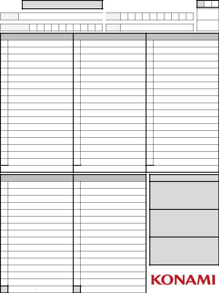 The Konami Decklist form is a document used by players participating in official Konami card game tournaments to register their deck. This form ensures that players list all cards in their deck, including the Main Deck, Side Deck, and Extra Deck, in a clear and detailed manner before playing in the event.
