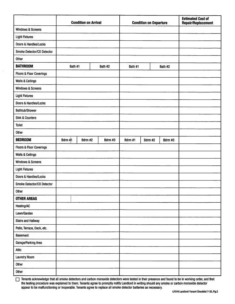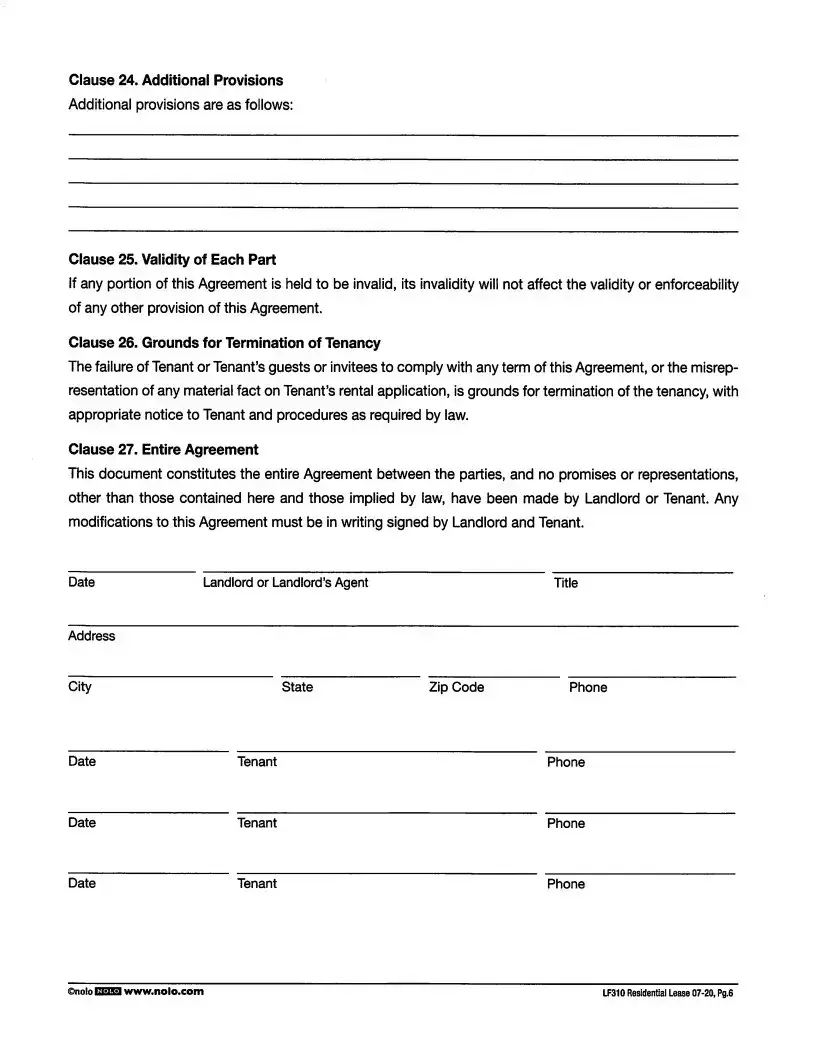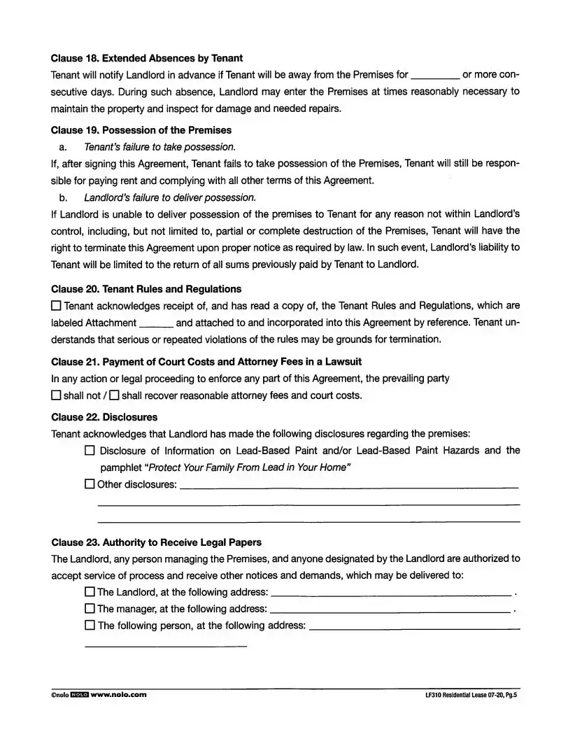 The LF310 Residential Lease is a legal document used for the arrangement between a landlord and a tenant when renting residential property. This form outlines the terms and conditions of the lease, such as the identification of both parties, the premises details, the lease term, payment schedules, and responsibilities regarding utilities, security deposits, late charges, and prohibitions on subletting and assignment.