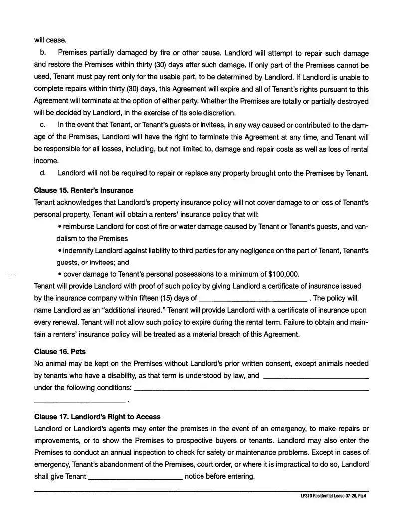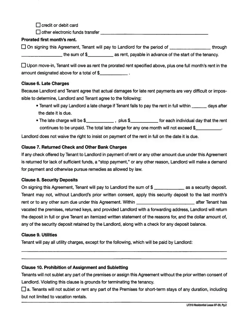 The LF310 Residential Lease outlines specific late charges if rent is not paid in full within a designated number of days after it's due. It includes a base late fee plus an additional daily charge until the rent is paid, though the total late charge for any one month is capped. This clause underscores the importance of timely rent payment and establishes preset penalties to avoid confusion or legal disputes over late payments.