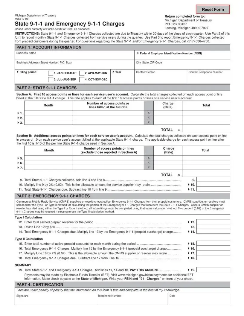 State 9-1-1 Charges are reported in Part 2 of the Michigan 4652 form. You will need to calculate the total charges collected for the first 10 access points or lines per service user’s account in Section A. For any additional access points or lines beyond 10, you will report those in Section B, using a different charge rate. Summing these totals will give you the overall State 9-1-1 Charges collected.