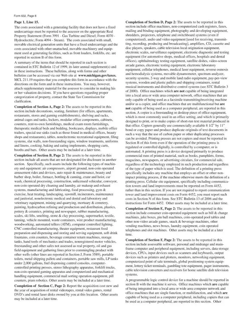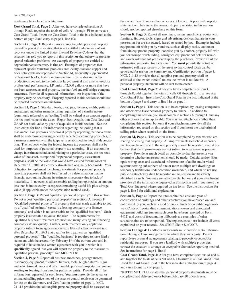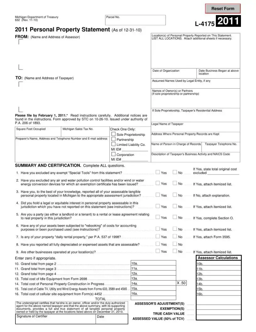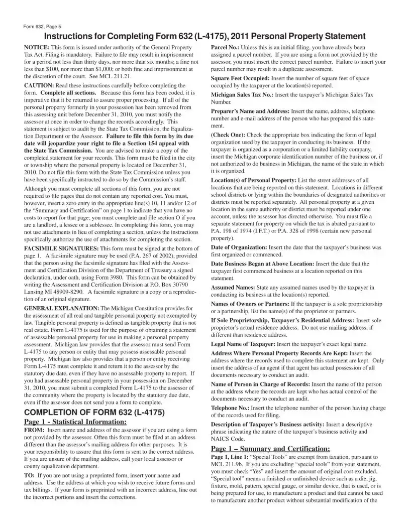 The Michigan 632 form, also known as the Personal Property Statement, is a document required by the Michigan Department of Treasury. It must be filed by businesses that own or possess tangible personal property in Michigan as of December 31 of the previous year. This includes items such as equipment, furniture, and other physical assets used in business operations. If your business operates in Michigan and you have personal property that is assessable, you need to file this form by February 1 each year to report your assets accurately.