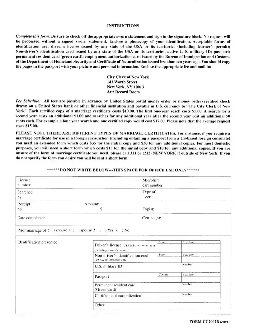 The New York CC2002B form is designed for individuals who wish to request a marriage record from the City Clerk's Marriage License Bureau. This form can be used to obtain marriage records from 1930 to the present. It allows parties involved in the marriage, their relatives, or authorized representatives to formally request copies of marriage certificates.