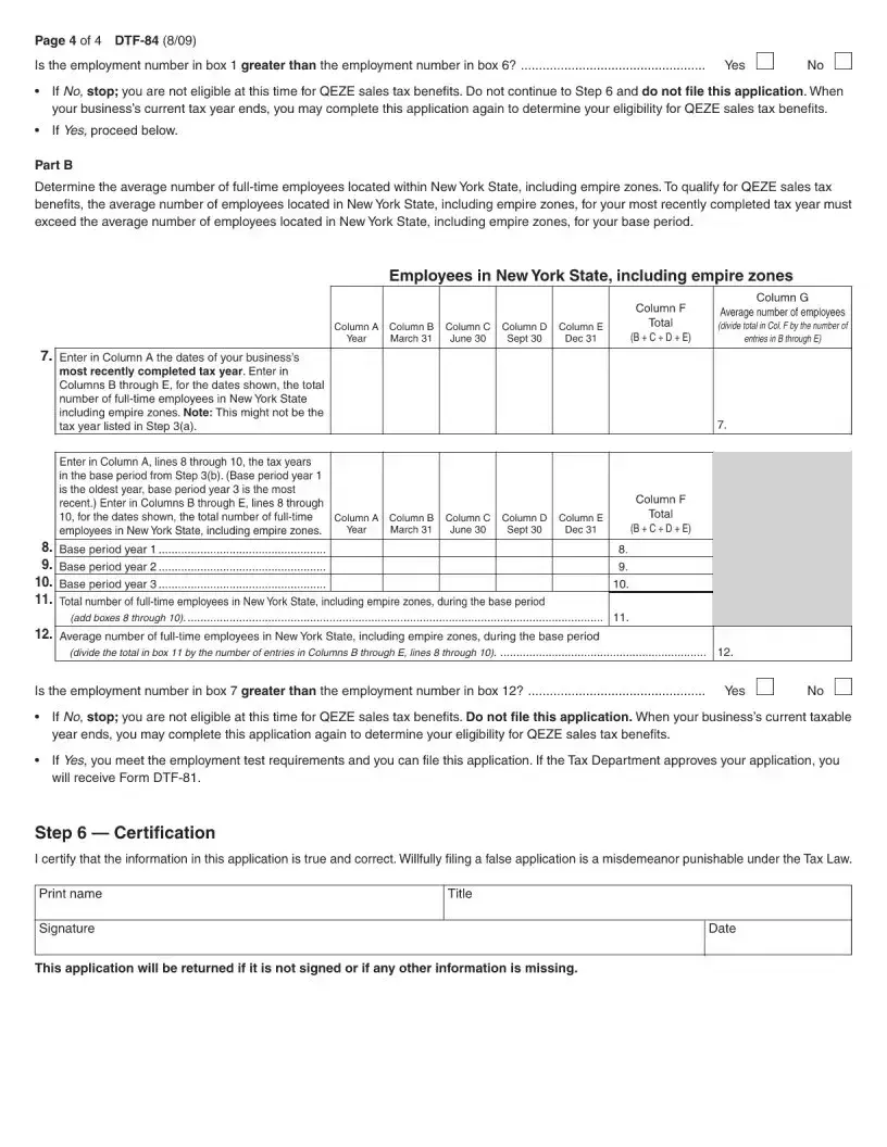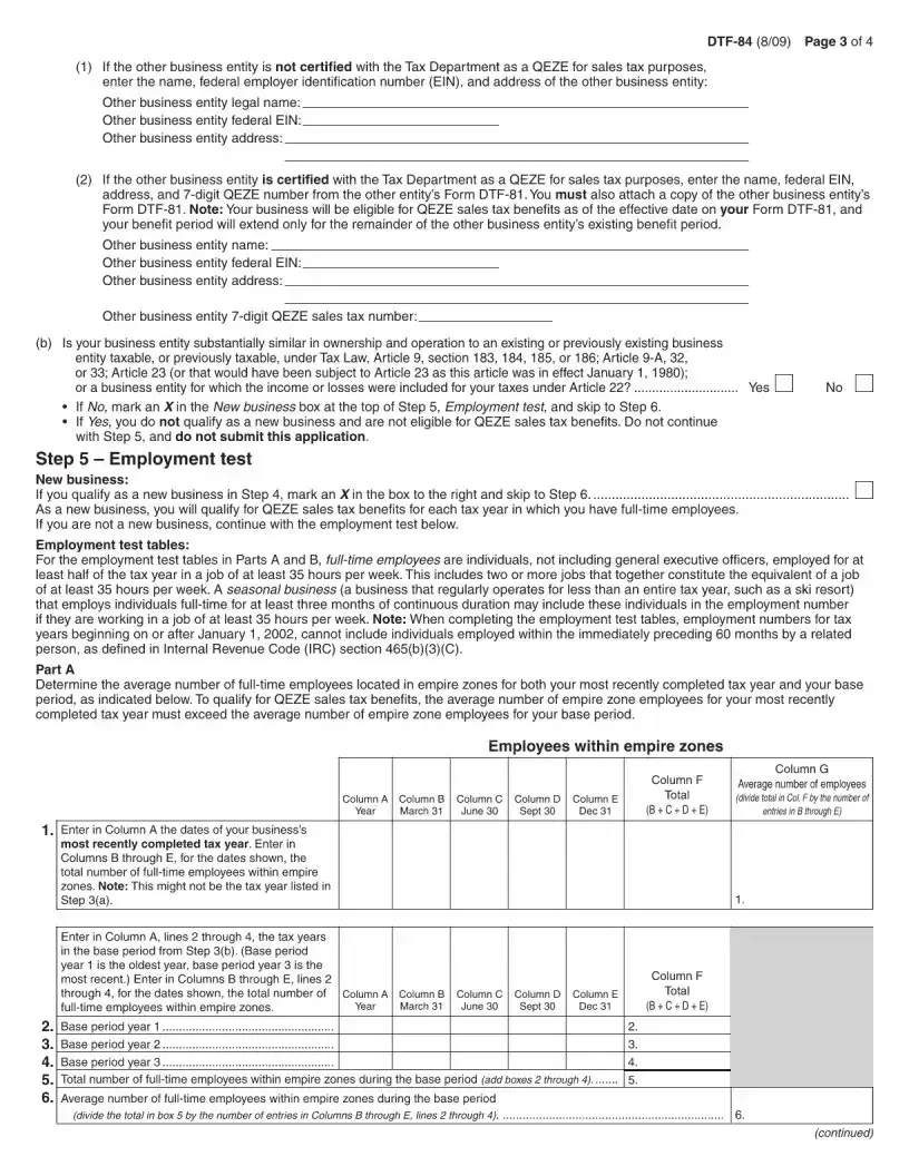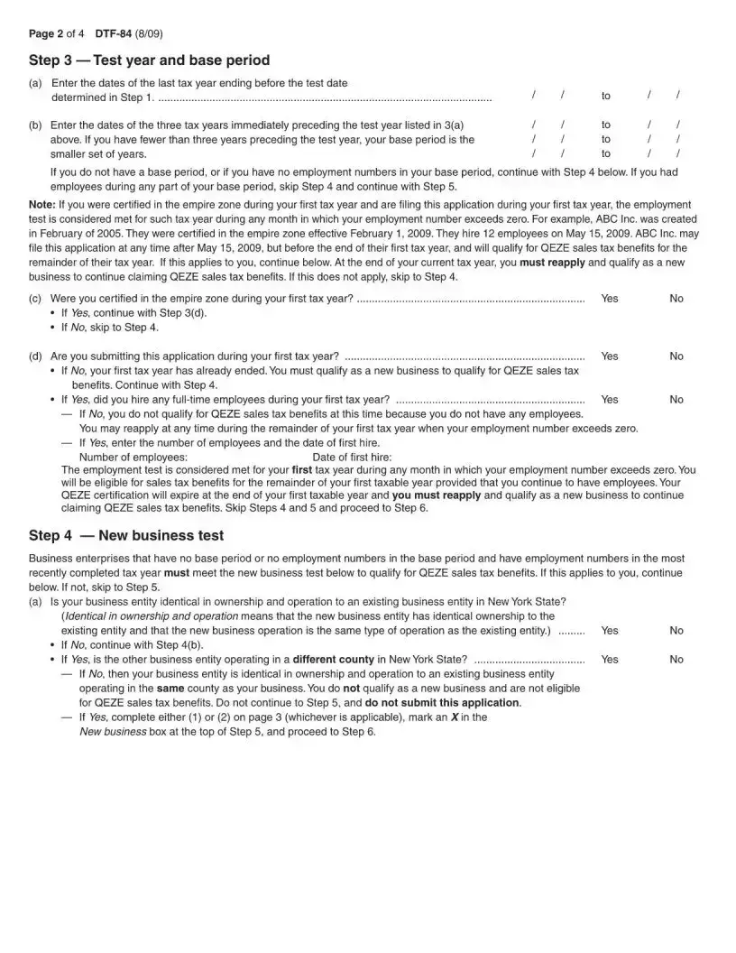The New York DTF-84 form is an application for businesses that are certified as Qualified Empire Zone Enterprises (QEZE). This form allows eligible businesses to apply for sales tax benefits. These benefits are available for a period of 120 consecutive months, starting from the effective date on Form DTF-81, provided the business meets certain employment criteria each year. The form is specifically designed for businesses that were certified by Empire State Development between April 1, 2005, and April 1, 2009.