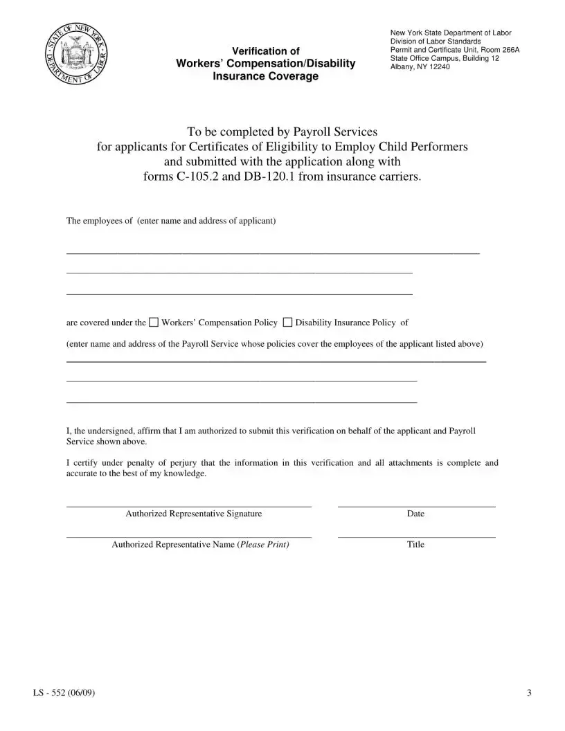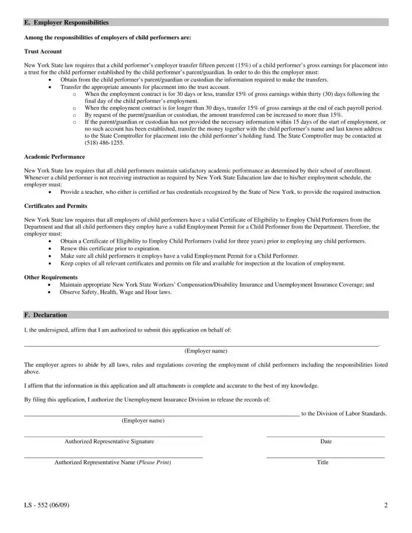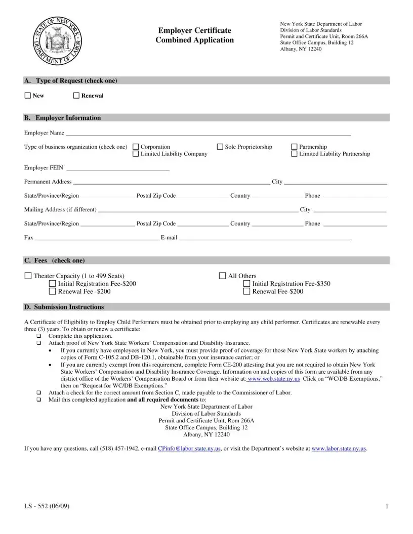 The New York LS 552 form is an application used by employers to obtain a Certificate of Eligibility to Employ Child Performers. This certificate is required before hiring any child performers in New York State. The form also serves as a renewal application for existing certificates, which must be renewed every three years.