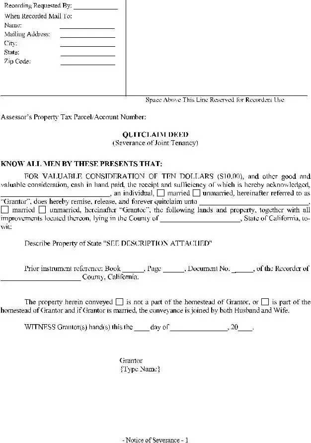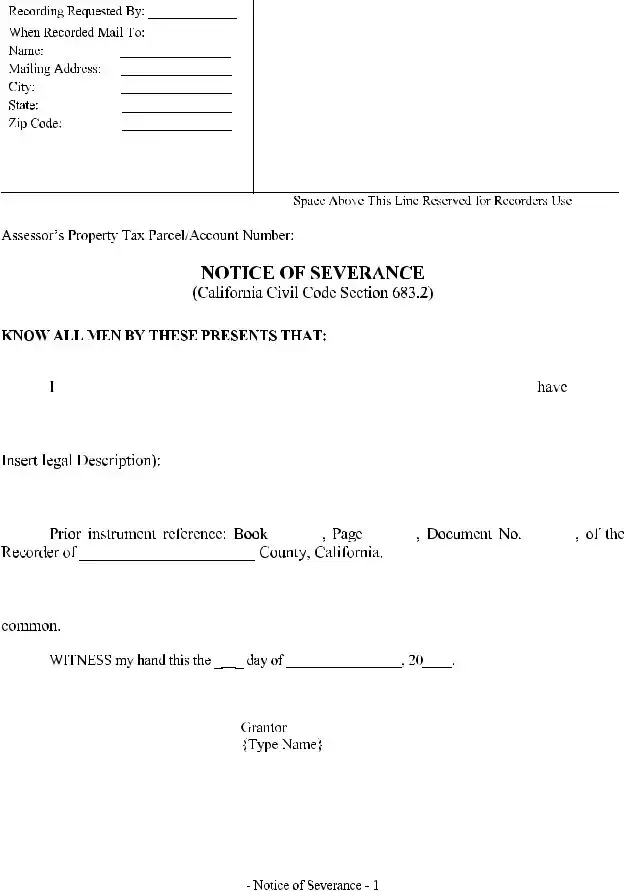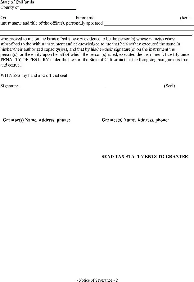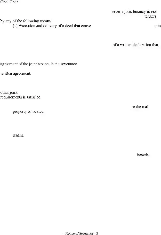 The Notice of Severance of Joint Tenancy form is a legal document used in California to officially sever a joint tenancy between co-owners of real property. This action changes the ownership from joint tenancy to tenants in common, which allows each owner to independently manage their share of the property.
