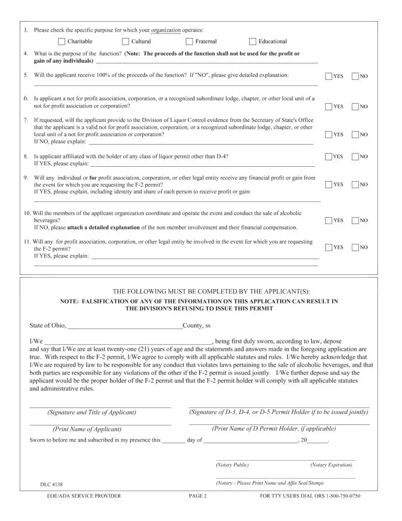 The Ohio F-2 Permit allows non-profit organizations to sell beer and intoxicating liquor at events. These events can last up to 48 consecutive hours and must conclude by 1:00 a.m. The permit is specifically designed for associations or corporations that operate for charitable, cultural, fraternal, or educational purposes.