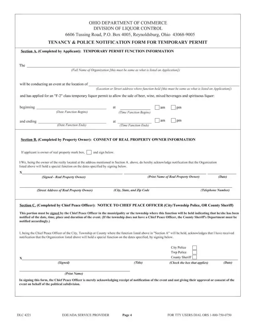 The application requires detailed information about the non-profit organization, including its exact name, address, and purpose. Additionally, it must include the date and time of the event, as well as the contact information for the individual responsible for compliance with liquor laws.