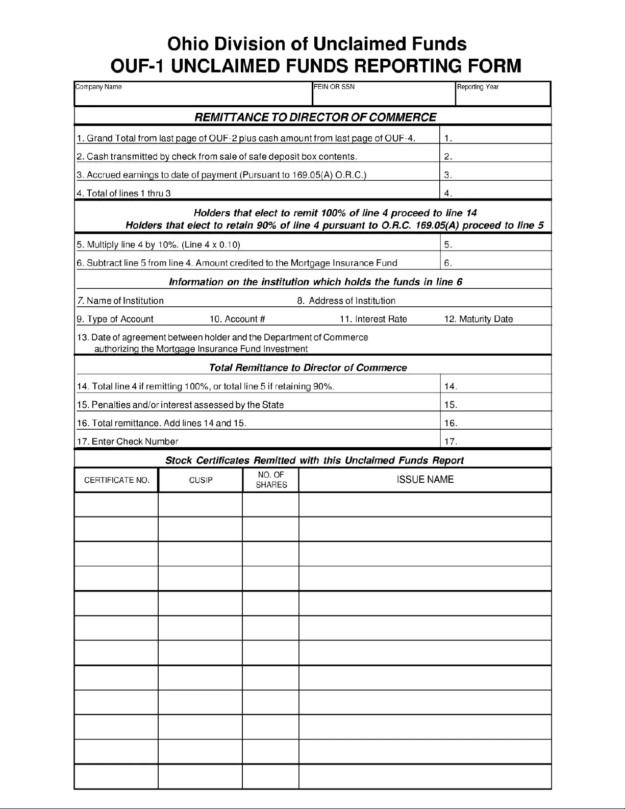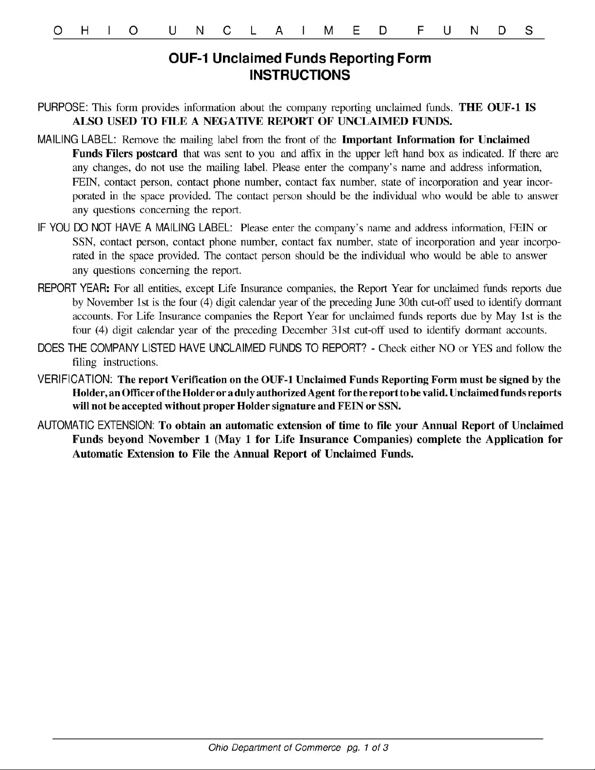The Ohio Unclaimed Funds Reporting Form, known as OUF-1, is designed to help companies report unclaimed funds to the state. This form is essential for ensuring that any unclaimed assets are properly documented and can be returned to their rightful owners. Additionally, the OUF-1 can be used to file a negative report, indicating that the company does not have any unclaimed funds to report. Accurate completion of this form is crucial for compliance with state regulations.
