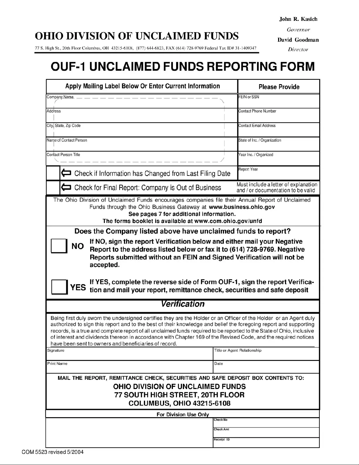 The verification section of the OUF-1 form must be signed by the Holder, an Officer of the Holder, or an authorized Agent for the report to be considered valid. If this signature is missing, the Ohio Division of Unclaimed Funds will not accept the report. This requirement ensures accountability and accuracy in the reporting process, so it is essential to complete this section before submission.