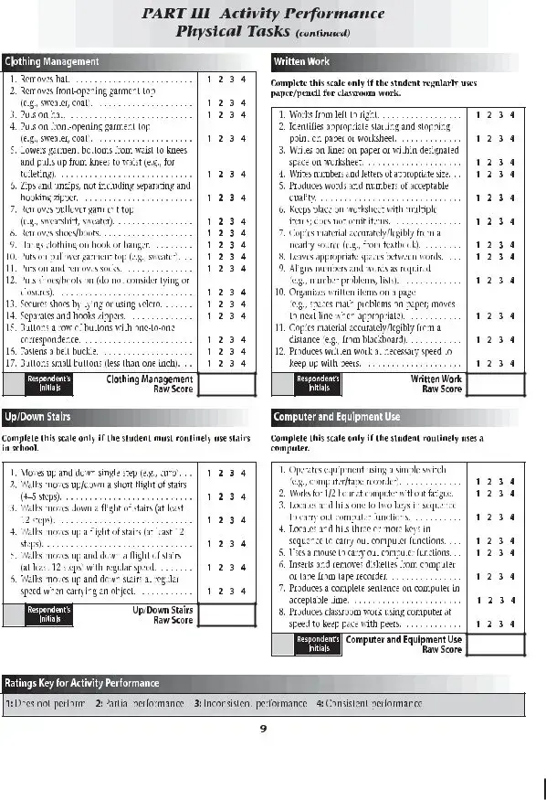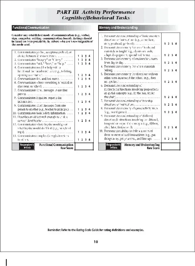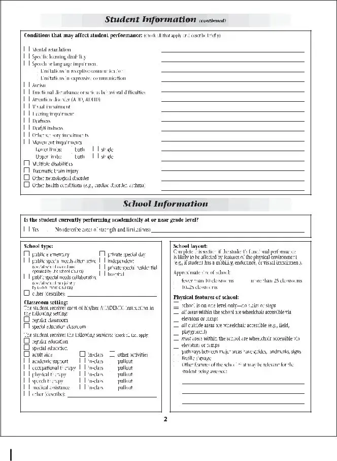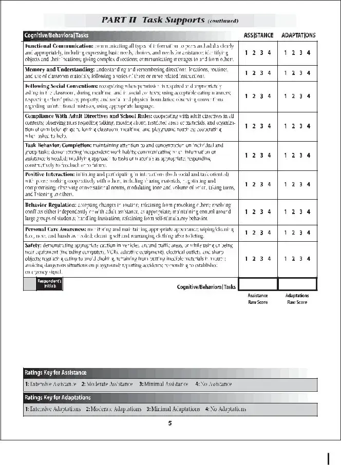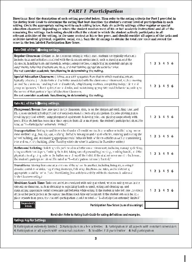 The School Function Assessment (SFA) form serves as a vital tool in evaluating a student's functional performance within the school environment. This assessment focuses on various aspects of a child's ability to participate in school-related tasks, addressing areas such as self-care, mobility, and social interactions. By examining these key components, educators and specialists can identify strengths and challenges that may affect a student's learning experience. The SFA provides a structured approach to gather information from teachers, parents, and the students themselves, ensuring a comprehensive understanding of each child's unique needs. Additionally, it aids in developing tailored interventions and support strategies, fostering an inclusive educational environment. Ultimately, the insights gained from the SFA empower schools to enhance student engagement and promote successful outcomes for all learners.