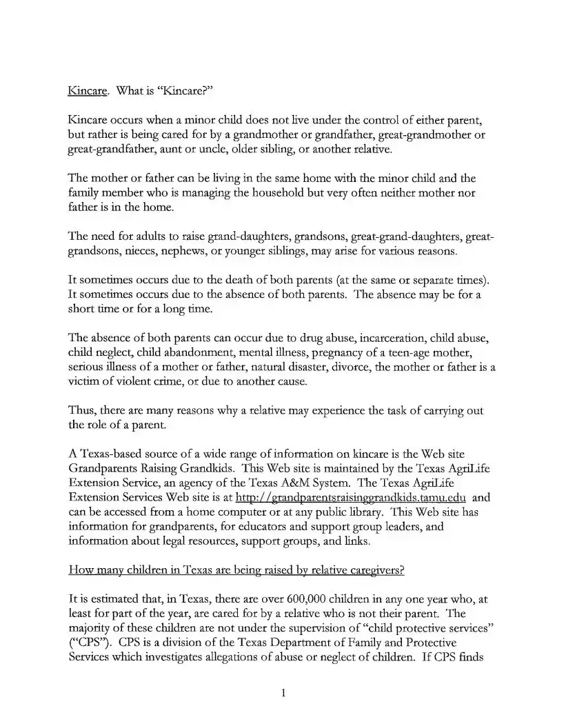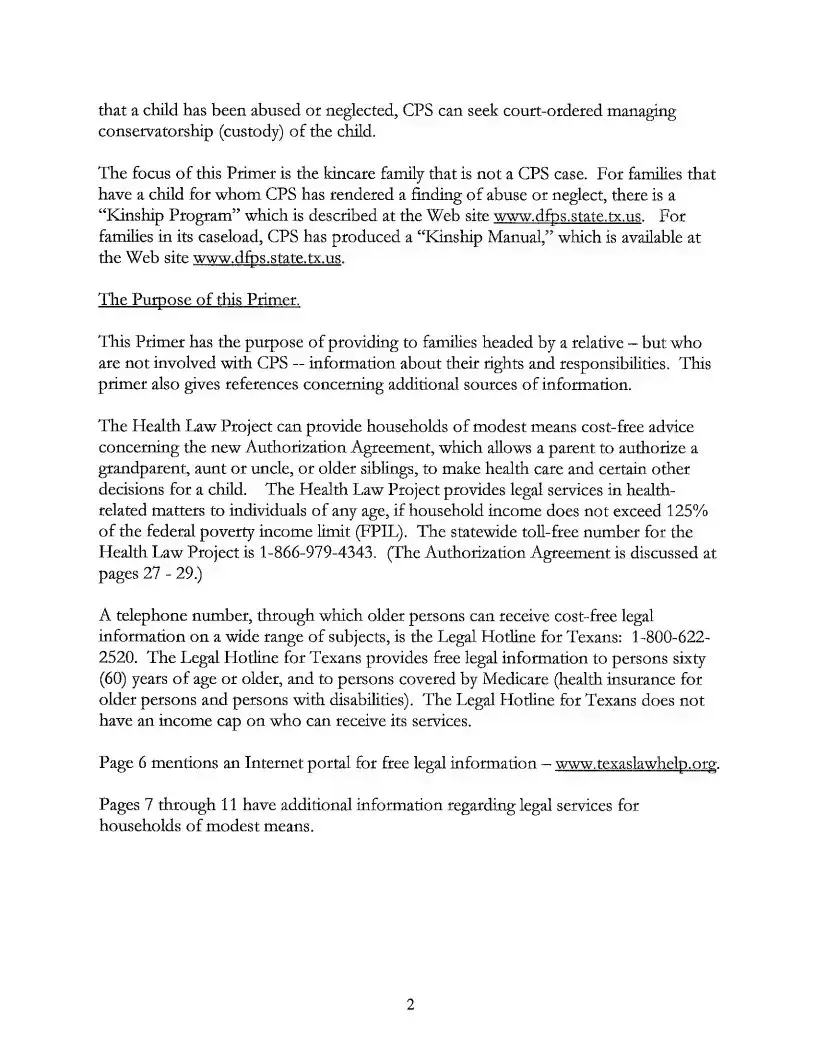 The Texas Kincare Primer is a resource designed to assist relatives who are caring for children. It provides information on the legal, financial, and emotional aspects of kincare, which refers to the care of minor children by relatives other than their parents. The Primer aims to help caregivers navigate the challenges they may face while raising these children.