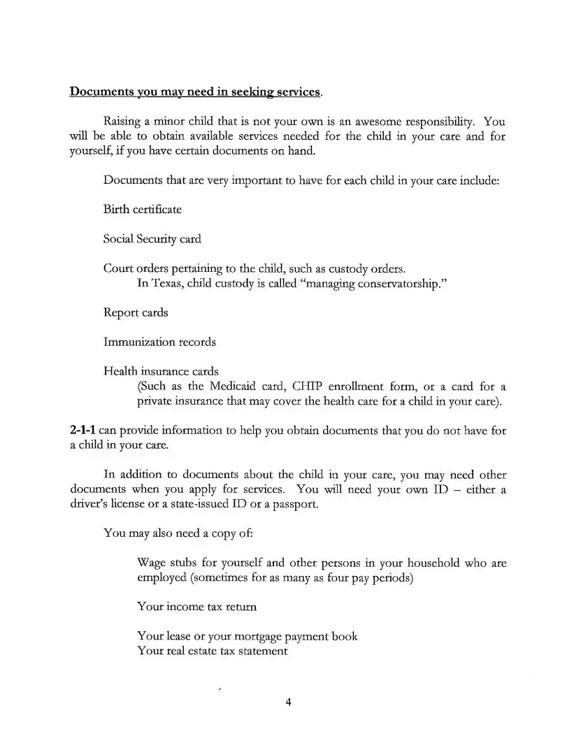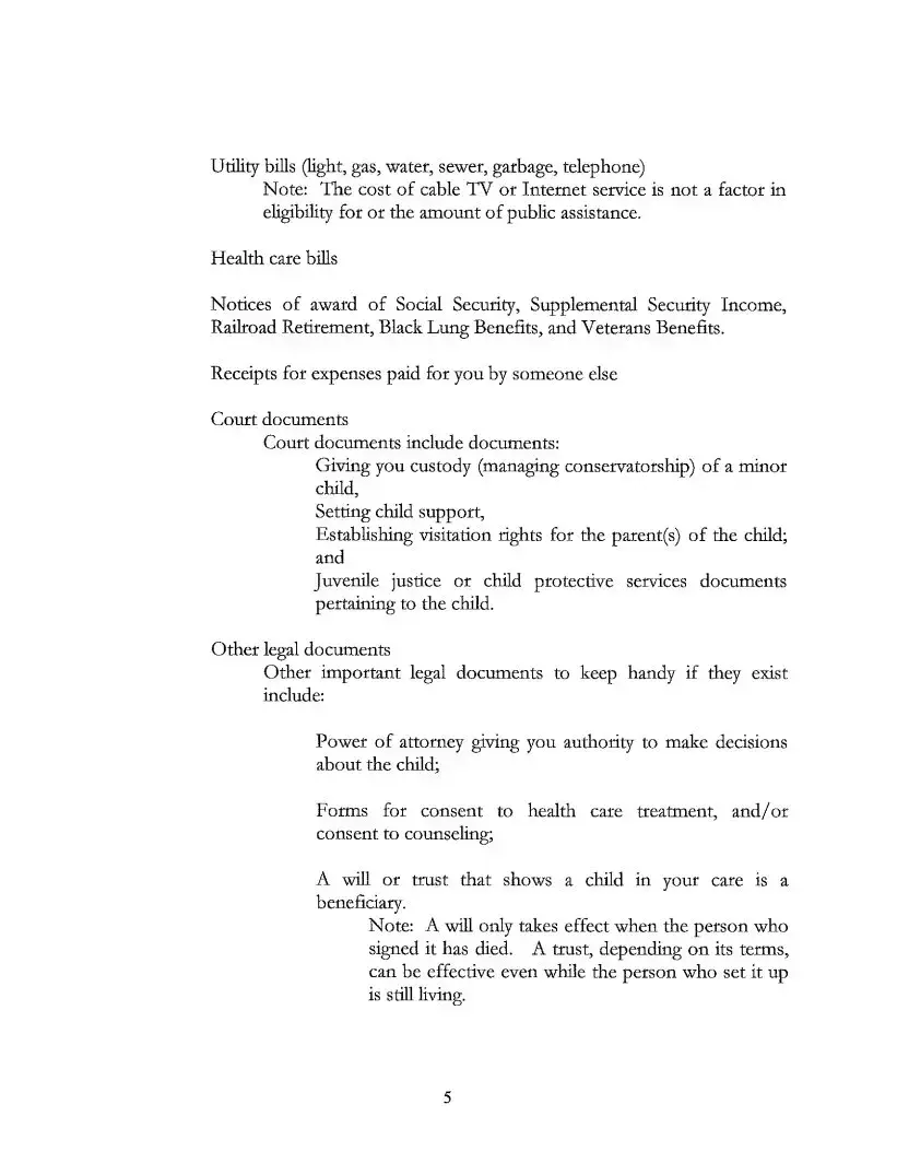 The Primer outlines various documents that may be necessary, such as proof of relationship to the child, identification, and any court orders that may pertain to custody or guardianship. Having these documents ready can streamline the process of accessing services and benefits.