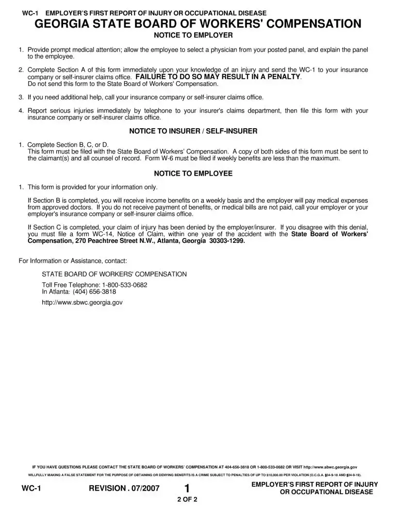 The WC-1 form should be submitted immediately after the employer becomes aware of the injury or occupational disease. Timely reporting is crucial, as failure to do so may result in penalties for the employer. It is important to ensure that the form is filled out accurately and completely to avoid delays in processing the claim.